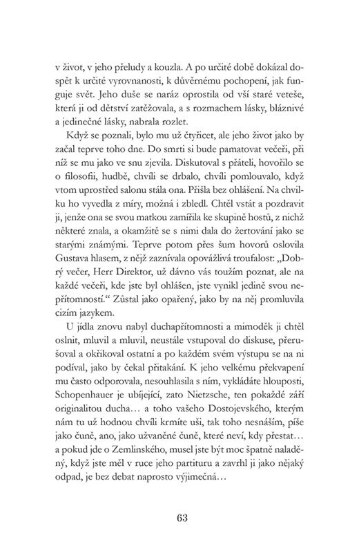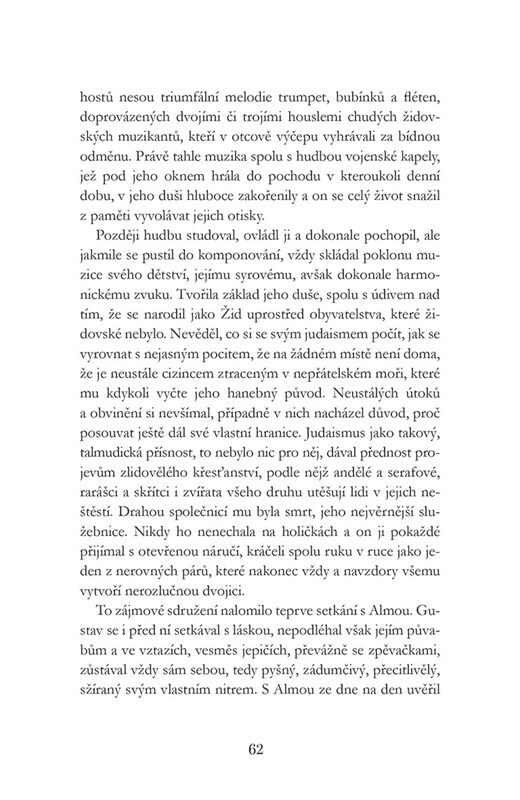 Román se noří do emocionálně náročného světa manželství Mahlerových. Zasnoubení vášnivé krásky s postarším Židem vyvolalo ve Vídni skandál. Navíc musela Alma slíbit, že se pro muže vzdá komponování. O osm let později obdrží Gustav dopis, je to milostné psaní pro Almu. Proč ho uhrančivý architekt...