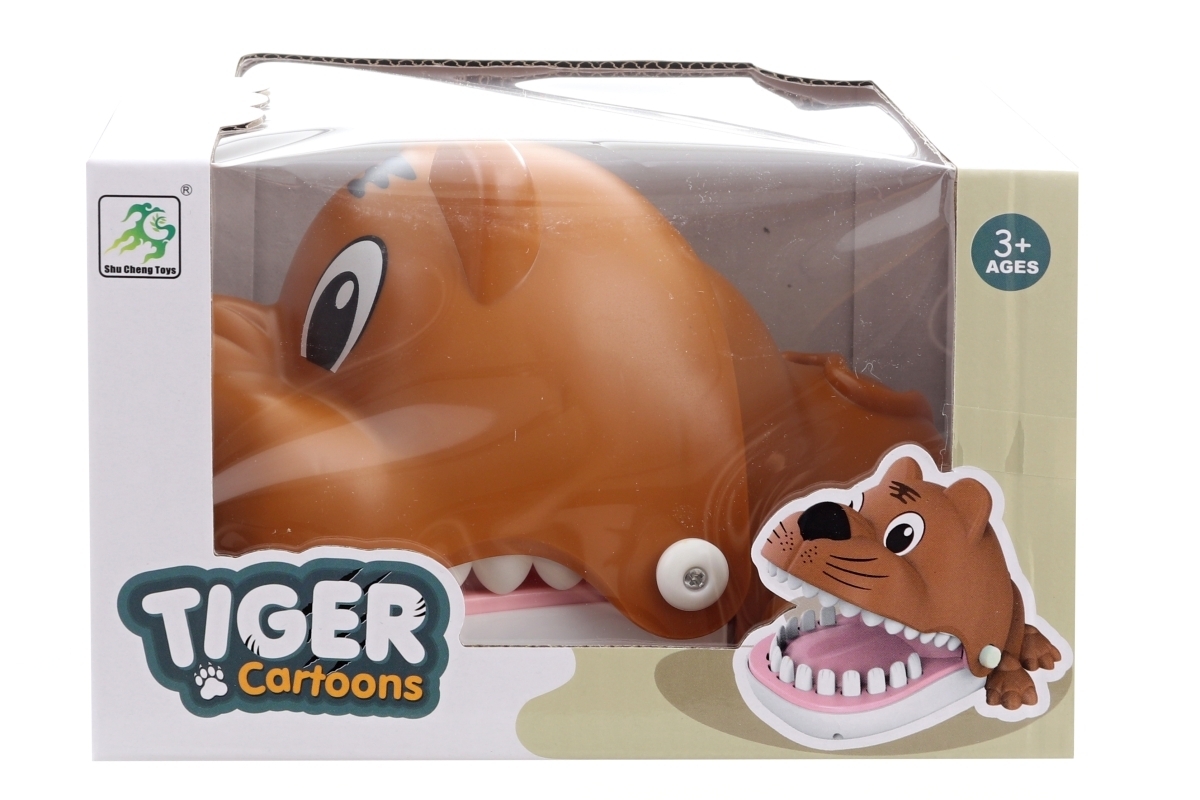 Hra tygří zuby. Materiál plast. Hráči postupně zatlačují zuby tygra a koho tygr nekousne, vyhrává. Baleno v krabičce. Rozměry balení 16x10x13 cm. Věk 3+