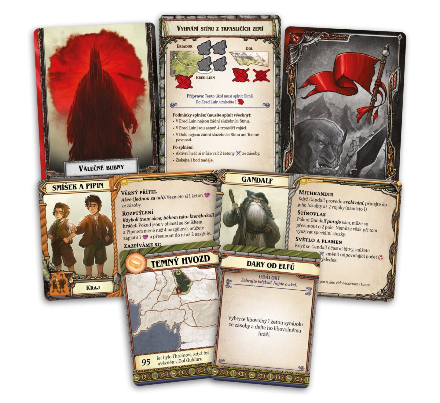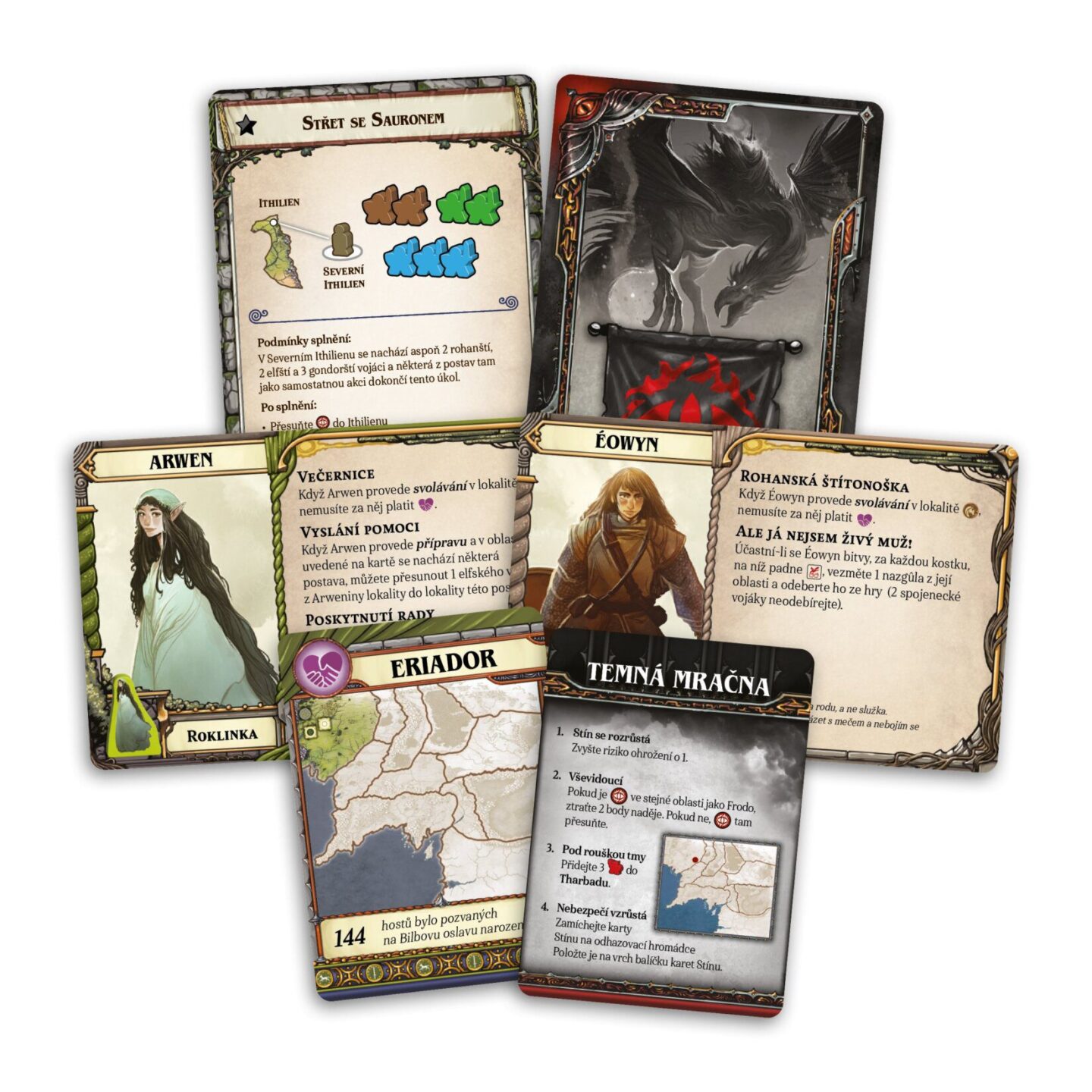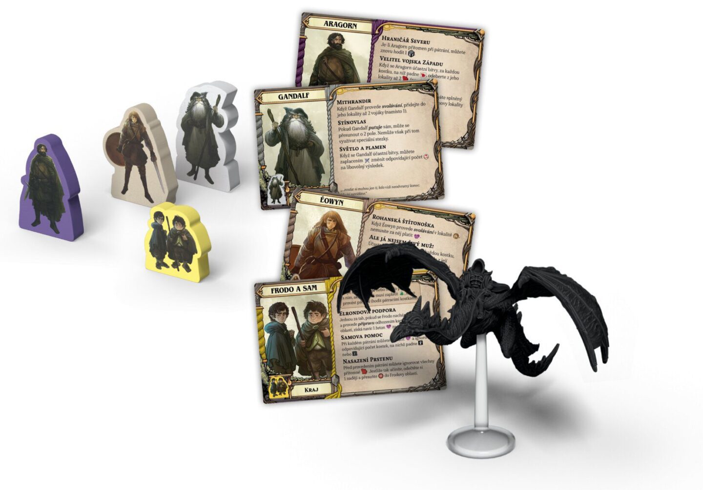sami - hra zahrnuje sólový režim navržený Mattem Leacockem. Obsah balení: 1 herní plán 48 karet oblastí 14 karet událostí 12 karet temných mračen 24 karet úkolů 10 přehledových karet 13 karet postav 50 karet Stínu 9 figurek nazgúlů 13 figurek postav 3 bojové kostky 7 pátracích