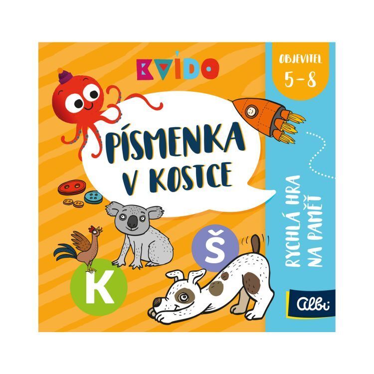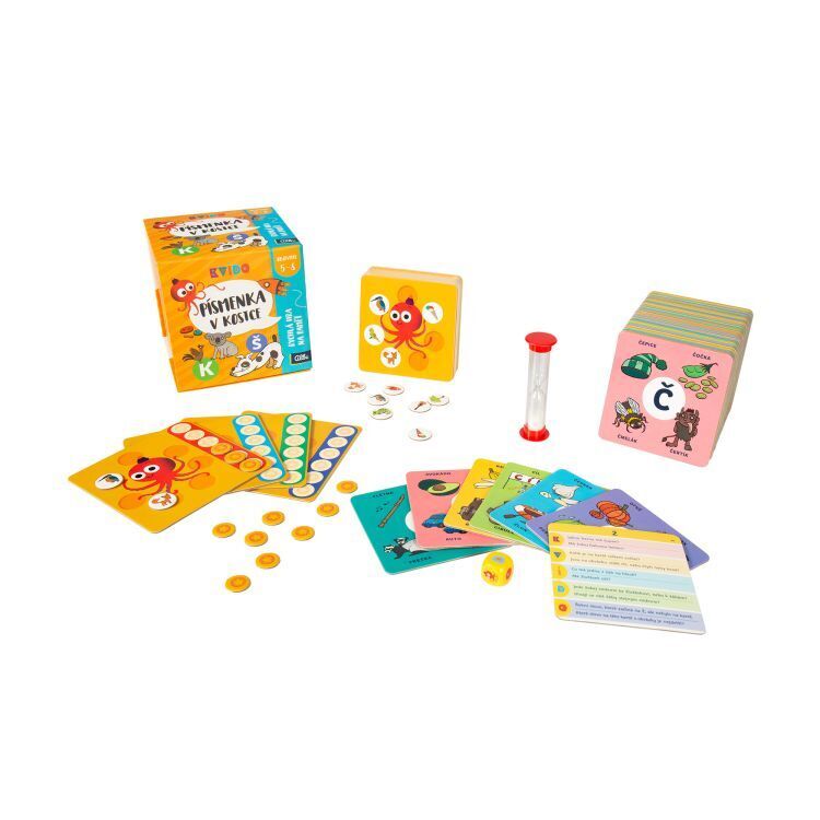 Ve hře Kvído V kostce Písmenka se hráči seznámí s nejznámějšími slovy, která na dané písmenko začínají. Hravým způsobem se tak mohou naučit naši abecedu. Na ilustrovaných kartách jsou znázorněny informace na téma písmenka. Hráči mají patnáct vteřin, aby si z vybrané karty zapamatovali co...