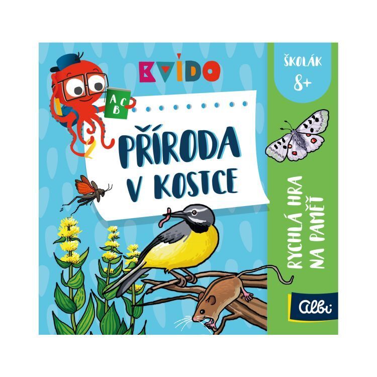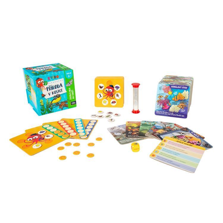 Ve hře Kvído V kostce Příroda se hráči seznámí s nejznámějšími živočichy a rostlinami naší planety a dozví se o nich mnoho zajímavostí. Na ilustrovaných kartách jsou znázorněny informace na téma příroda. Hráči mají patnáct vteřin, aby si z vybrané karty zapamatovali co nejvíce,...