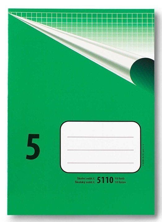 Klasický školní sešit číslo 5110, formát A5, 10 listů, čtverečkovaný, 10 x 10 mm. br brŠkolní sešity mají pevnou papírovou obálku v klasickém retro designu. Na přední obálce je několikařádkový prostor pro nadepsání jména a příjmení, třídy nebo školního