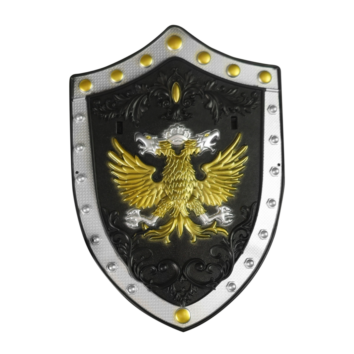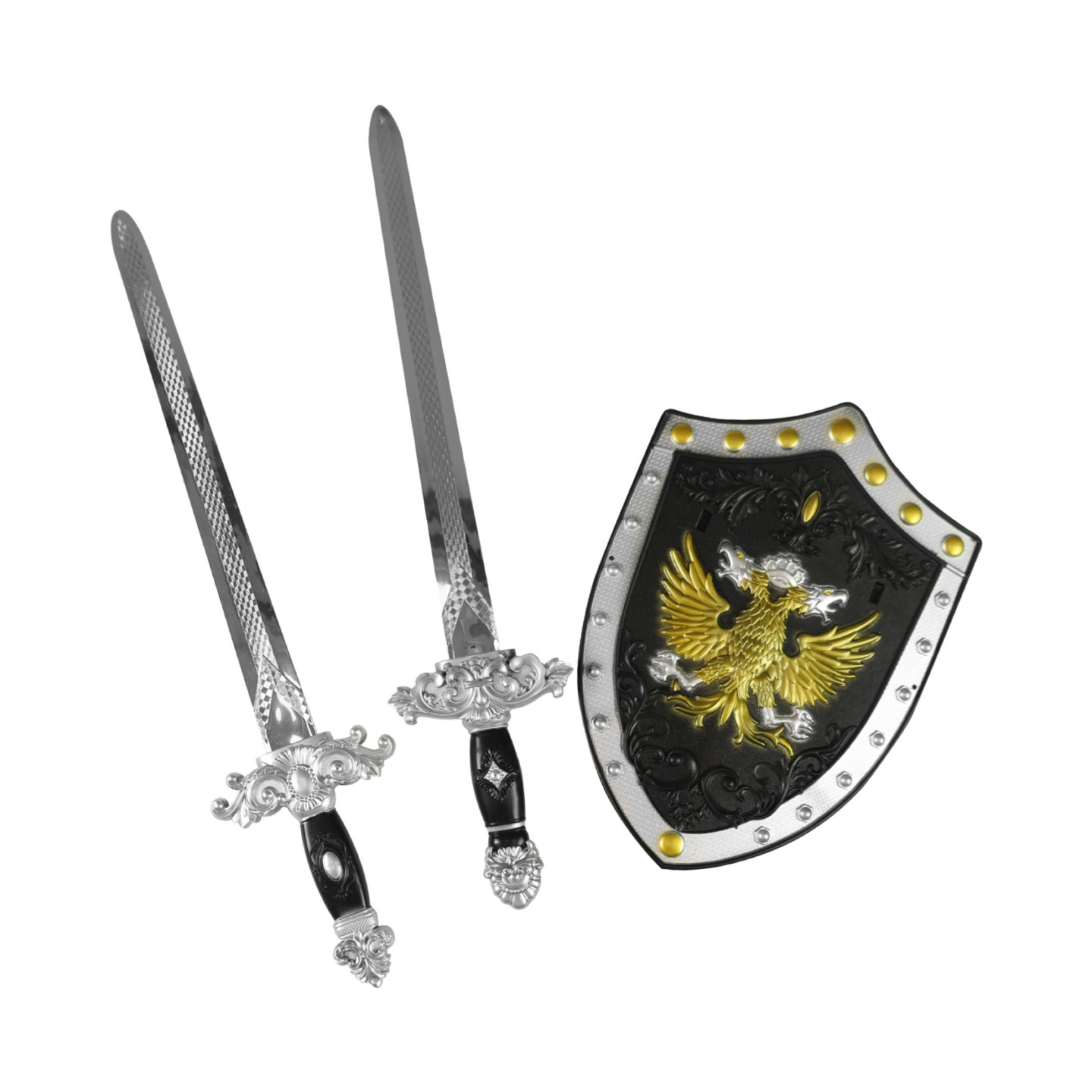 Nasaď si štít na ruku, uchop meč a hurá do rytířského boje! Set obsahuje 2 stříbrné meče v délce 49 cm a jeden zdobený štít s erbem.