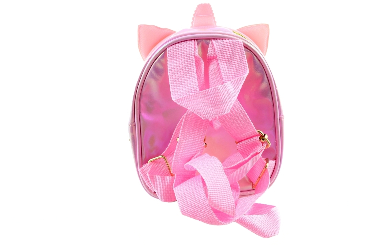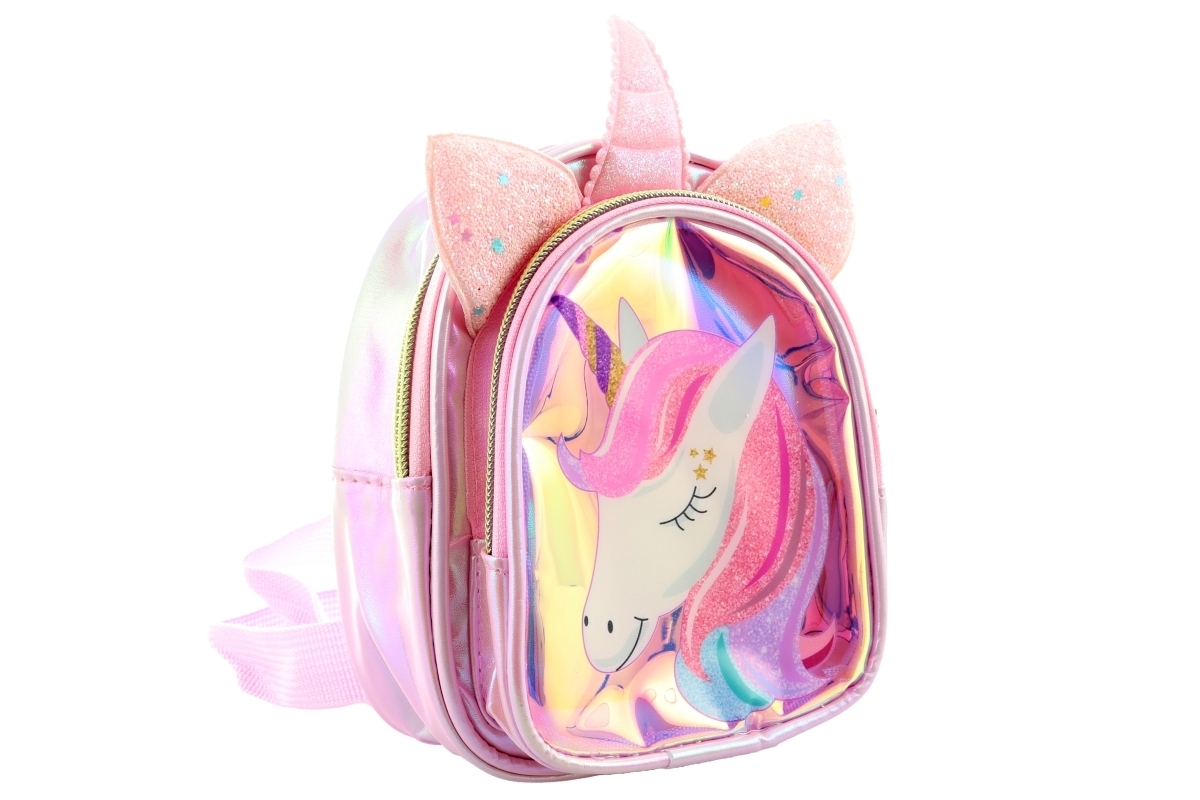 Malý batůžek s krásným motivem jednorožce. Batůžek má 2 kapsy na zip. Přední kapsa je průhledná. Celý batůžek je z lesklého materiálu. Rozměry 14x17x8 cm. Baleno v sáčku. Výrobek není hračka.