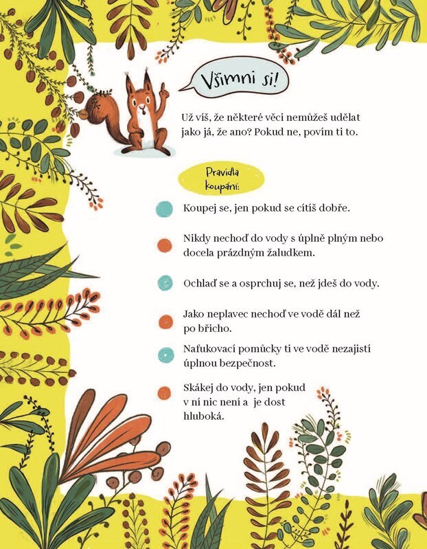 To je ale horko! Myška, liška a havran padají vedrem. Veverka ví, co dělat. Hop do studeného jezera! Ostatní váhají, nechtějí si namočit kožíšky. Ale ouha, veverka má potíže, co teď? Letní obrázková knížka nejen pro všechny, kdo se rádi cákají ve vodě.