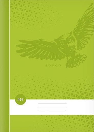 Školní linkovaný sešit ve formátu A4, v zelené barvě, s motivem sovy, v deskách z křídového papíru. Stránky jsou opatřeny okraji...