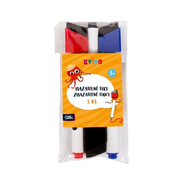 Náhradní mazatelné fixy ke hrám od Kvída - Závodu barev, Povídačkám, Hádankám na cesty, Roztančeným fixám, Hravému čtení. Balení obsahuje: 3 barevné fixy - červenou, modrou a černou.
