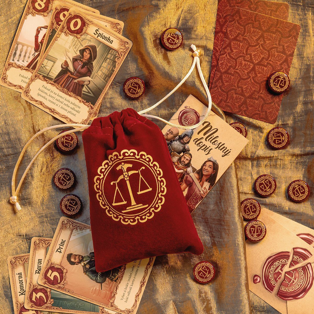 hry. Další odlišností od "klasické" verze, kromě vyššího počtu karet, je přítomnost bodovacích žetonů a látkového pytlíčku na skladování hry. Obsah balení: 21 karet s postavami 6 přehledových karet 13 žetonů přízně 1 látkový pytlík 1 česká pravidla