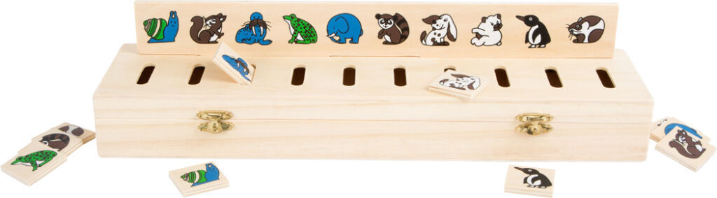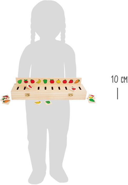 Tato pěkná krabička má 5 zásuvných desek a 50 čtverečků se symboly. Je to dřevěná vkládací hra, která trénuje rozeznávání barev a různých předmětů – oblečení, zvířata, ovoce. Najdete zde ale také geometrické tvary a číslice. Čtvercový dílek s motivem spárujte a poté vhoďte do správného otvoru....