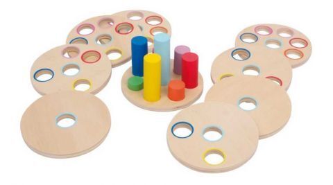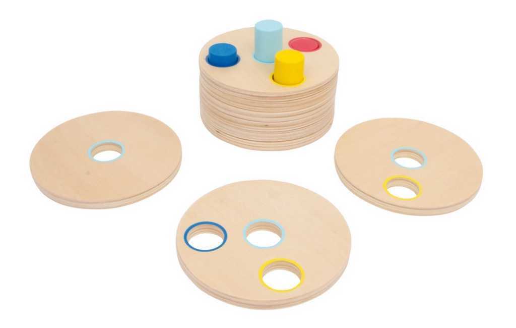Dobře si prohlédni, přemýšlej, zkoušej a vhodně nasaď – skvělá nasouvací hra pro trénování motoriky, koordinace ruky a oka. Pevné kotouče (tloušťka 1 cm) z jemně broušené překližky mají být nasunuty na barevné tyče. Tyče jsou různých délek a každý disk má vždy o jeden otvor méně než předchozí,...