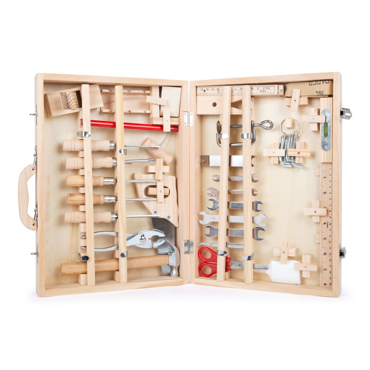 Kufřík Deluxe je komplexní sada nářadí: Závěsná dřevěná krabice s 48 díly pro malé domácí kutily! V kufříku Deluxe najdete všechno potřebné dřevěné i kovové nářadí pro všechny druhy prací a oprav. Najdete v něm klíče, šroubováky, pilu, nůžky, dláto, tesařskou tužku, šestihranný klíč, kladivo a...