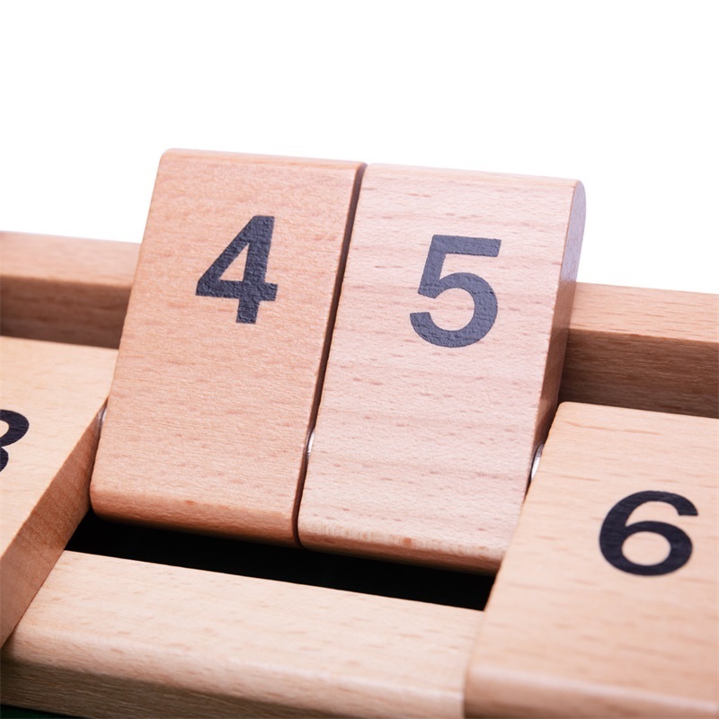 Zábavná hra, která dětem zlepší jejich numerické dovednosti. Hoďte dvojicí kostek a zavřete destičky, (maximálně dvě) které se rovnají celkovému počtu hodů kostkou. Pokračujte ve hře dokud nebude možné zavřít žádné další destičky. Zbylý součet neotočených destiček si zapište. Hraje se do...