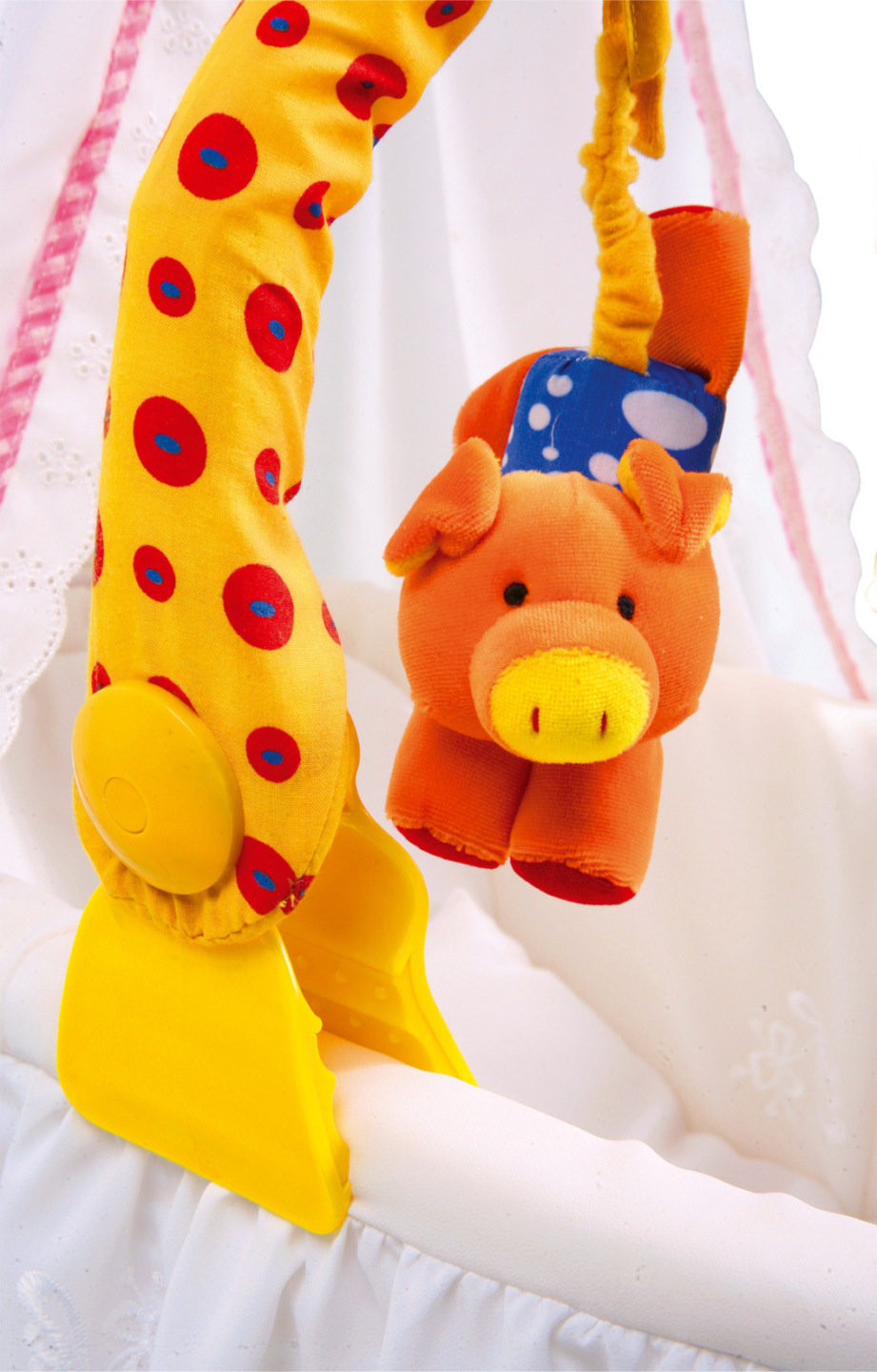 Hezké zaměstnání dětských očí, ohebný, látkou potažený plastový/kovový oblouk lze připevnit svorkami na kočárek, dětskou postýlku nebo na golfový kočárek. Při pohybu začnou barevná zvířátka „létat“ a rozezní rolničky nacházející se uvnitř zvířátek! Rozdílné látky osloví hmatový smysl miminek a...