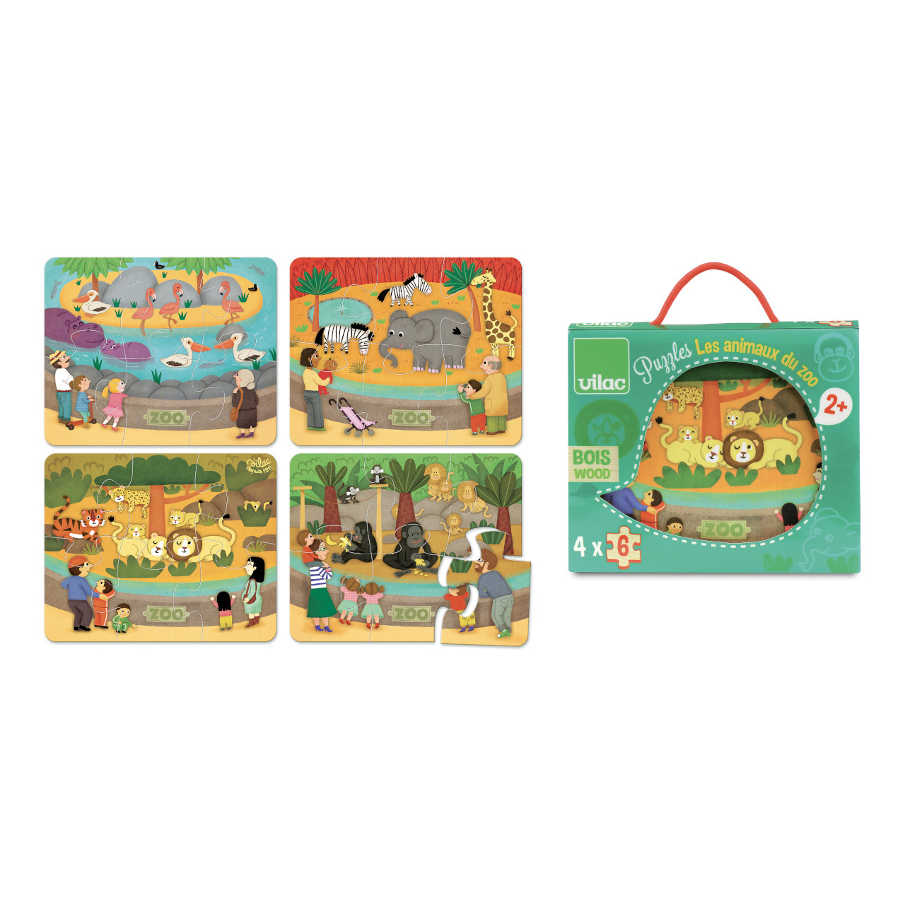 Dřevěné puzzle o šesti dílcích s tematikou ZOO. Zabaleno v pěkném dřevěném boxu s bavlněnou rukojetí. Hlavní vlastnosti: 4 puzzle po 6 dílcích praktický úložný box