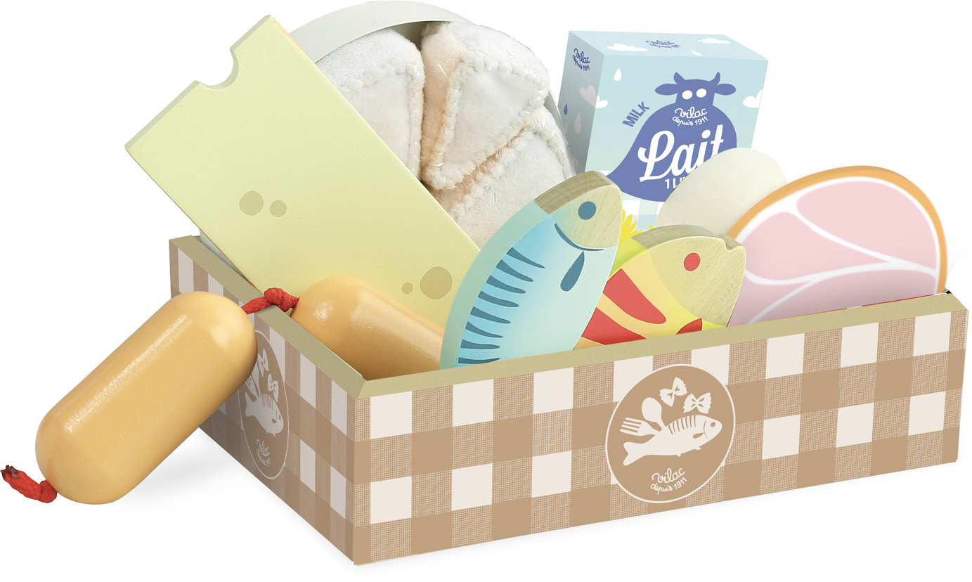 Pěkný lepenkový box obsahuje 2 ryby, plátek šunky, vejce, krabici mléka, sýr a špekáčky. Tento set je ideálním doplňkem do kuchyněk Vašich dětí, 11 dílná sada. Hlavní vlastnosti: vhodné do každé kuchyňkypotraviny vyrobené ze dřevaobsahuje 11 ks