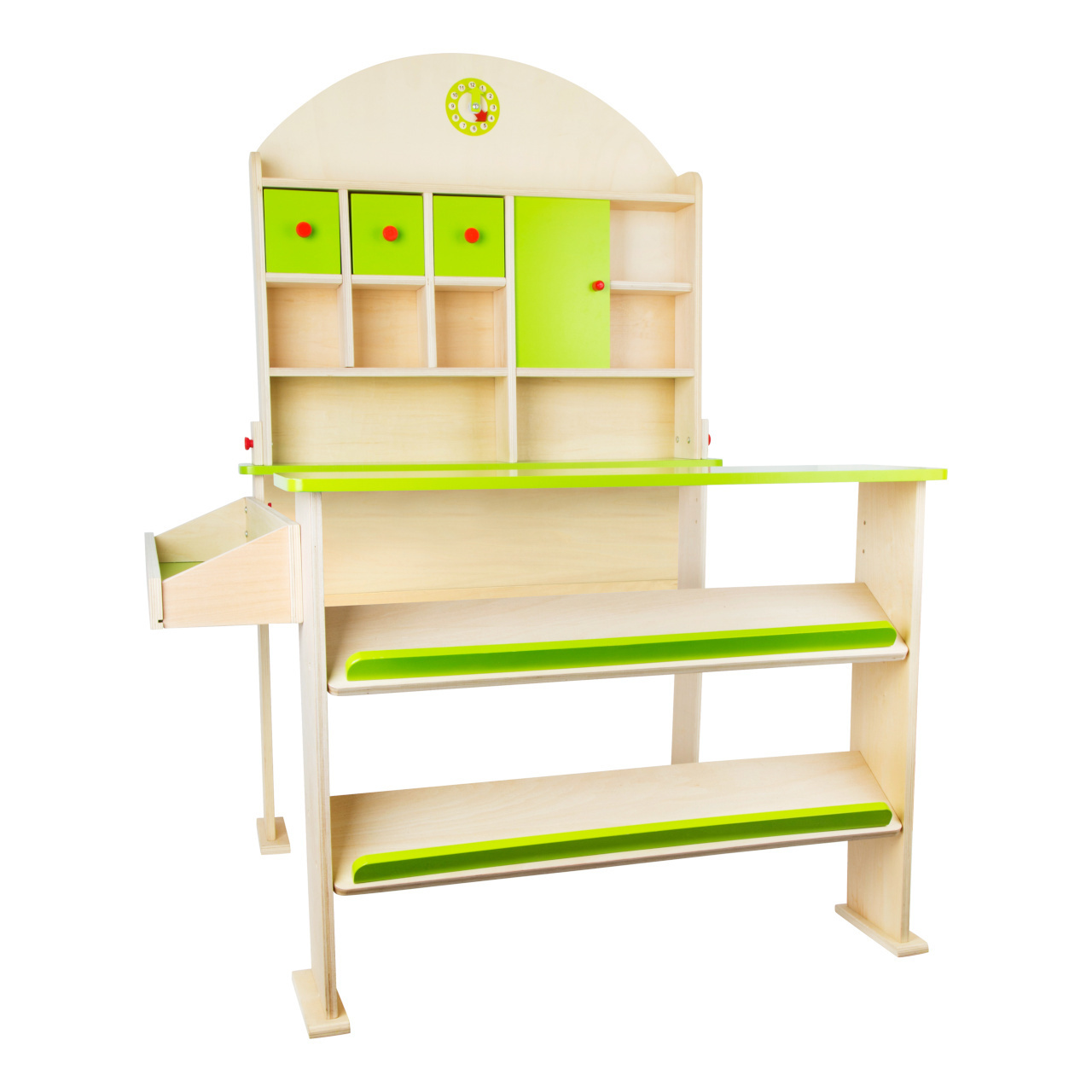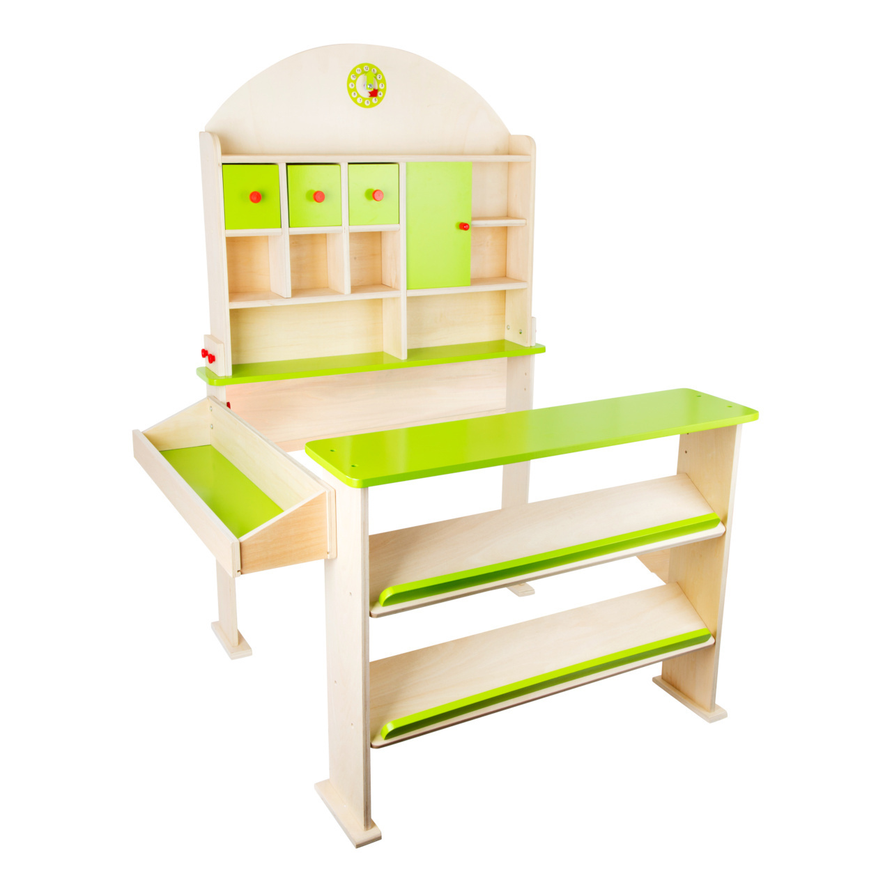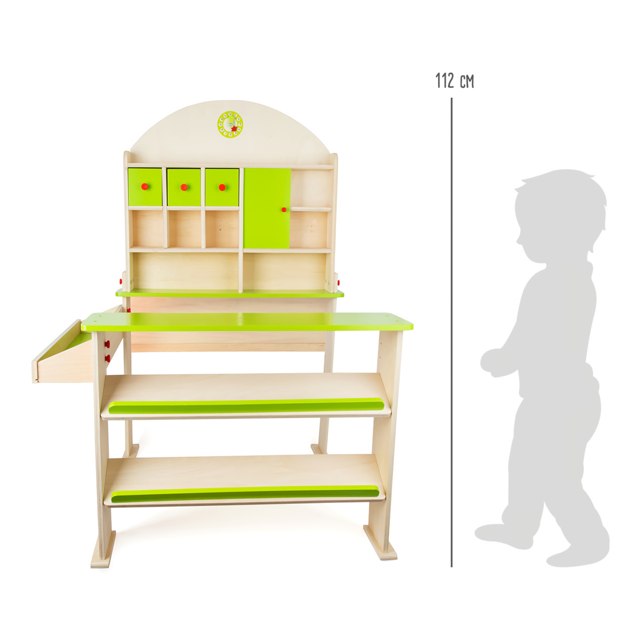 Podpořte své děti v poznávání společenských zvyklostí a rozvíjení komunikačních i početních dovedností pomocí moderního prodejního stánku. Jeho základem je prostorný pult, na který lze pohodlně umístit řadu doplňkového příslušenství, například pokladnu, váhu