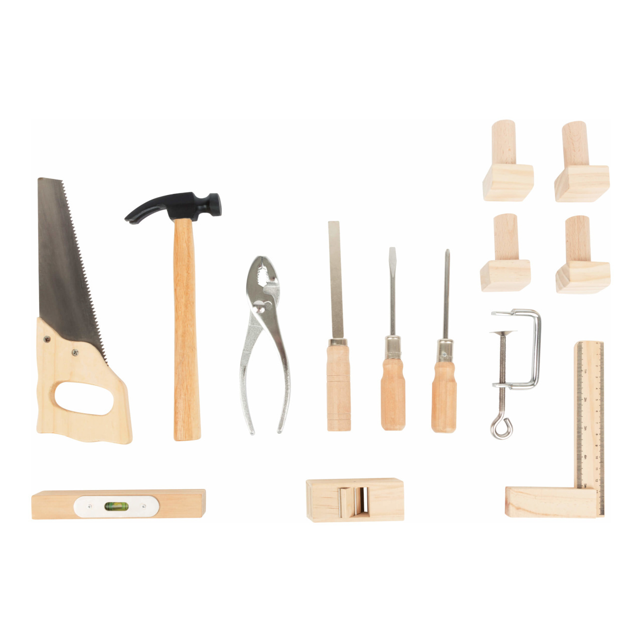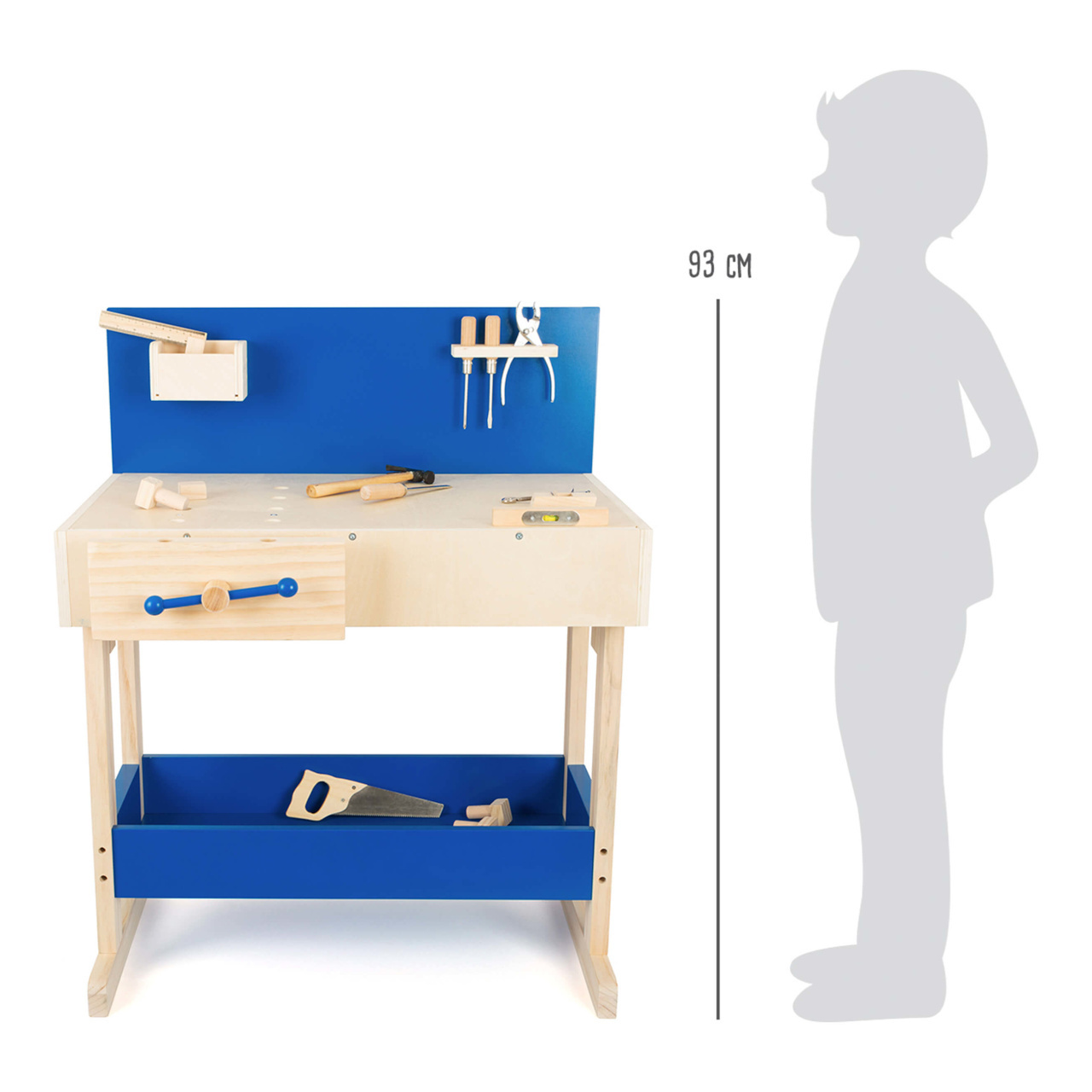 Dřevěný ponk vyrobený z masivu s policemi v modré barvě. Pod pracovní deskou, kterou lze přizpůsobit výšce dítěte, je úložná police na nářadí. Zadní stěna ponku je opatřena praktickým držákem na nářadí a úložnou přihrádkou pro drobné součástky. Nářadí je svými rozměry vhodné pro malé kutily....