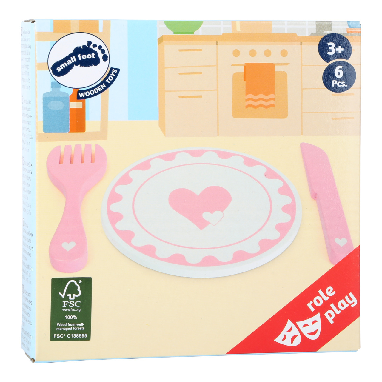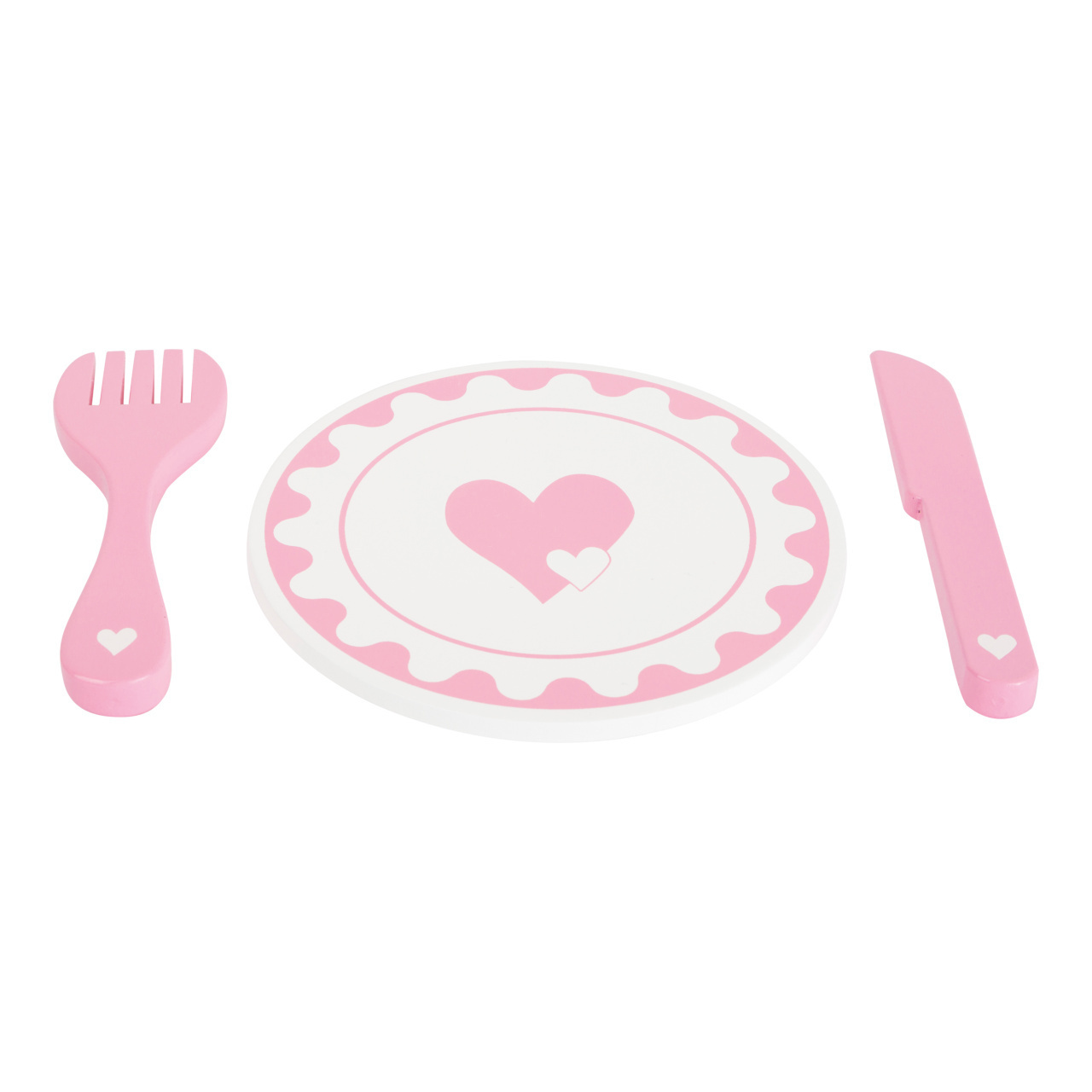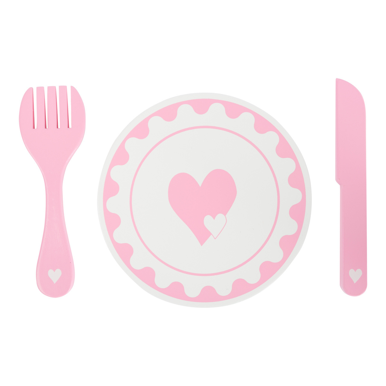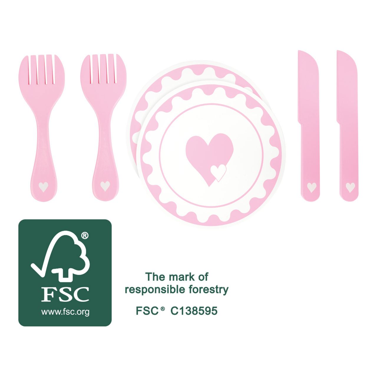 Pohádkové prostírání! Jídlo z dětské kuchyňky bude díky těmto talířům chutnat ještě lépe a děti se při hře mohou naučit správnému stolování. Malý dřevěný servis je dekorován srdíčky. Vyrobeno ze 100% certifikovaného FSC® dřeva. Hlavní vlastnosti: 2 talíře,