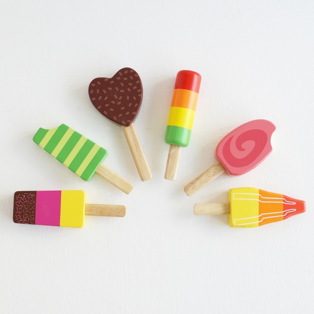 Sada šesti ručně malovaných nanuků je perfektní pro představivou hru. Odolná hračka z pevného kaučukového dřeva, které nechybí ani dřevěný stojan, v kterém lze nanuky servírovat. Čokoládové, ovocné i smetanové, každý z nich má vlastní realistický design plný