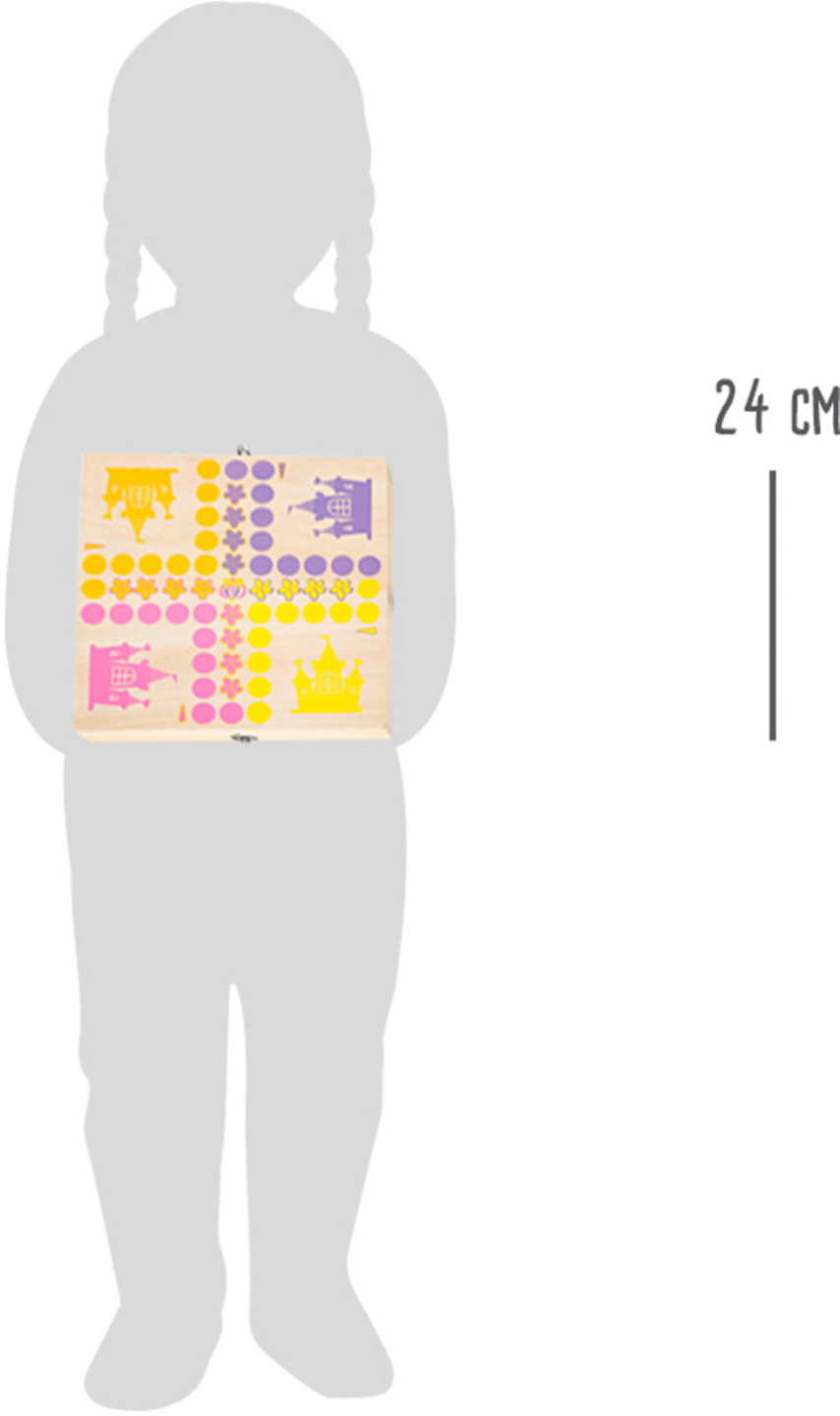 Která královská princezna dostane jako první svou korunu? Čtyři týmy různě barevných 3D princezen ze 100% FSC® certifikovaného dřeva čekají na svůj tah. Kostka ukazuje, o kolik polí se mají princezny pohnout. S touto hrou si děti potrénují porozumění číslicím a také
