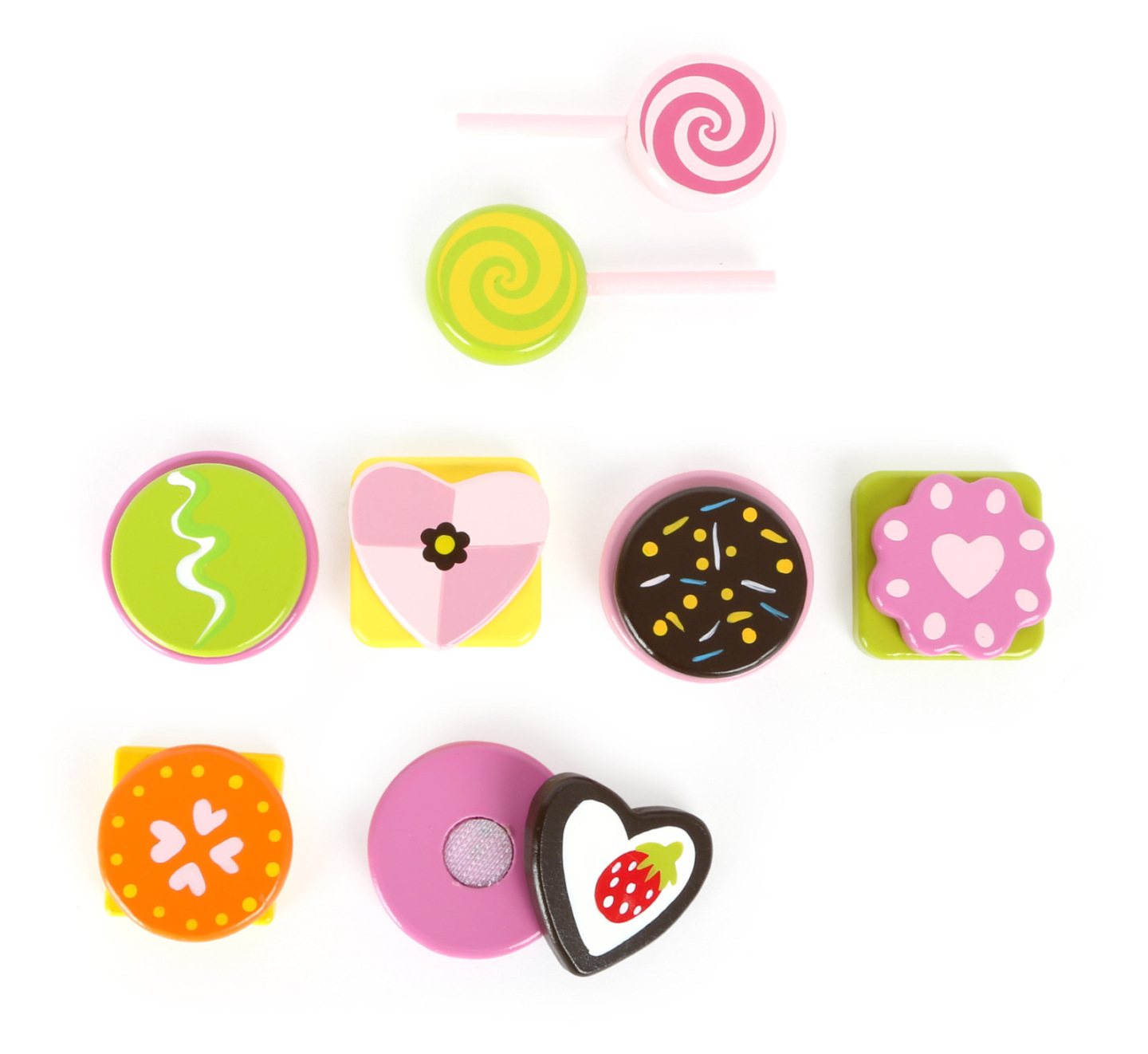 Kdo může odolat těmto sladkostem? Tento barevný výběr ze sladkostí vyrobený ze 100% certifikovaného dřeva FSC® s lízátky, sušenkami a pralinkami je skutečným poutačem na konferenčním stolku. Oddělování pomocí suchého zipu. Díky suchým zipům lze lahůdky skládat znovu a