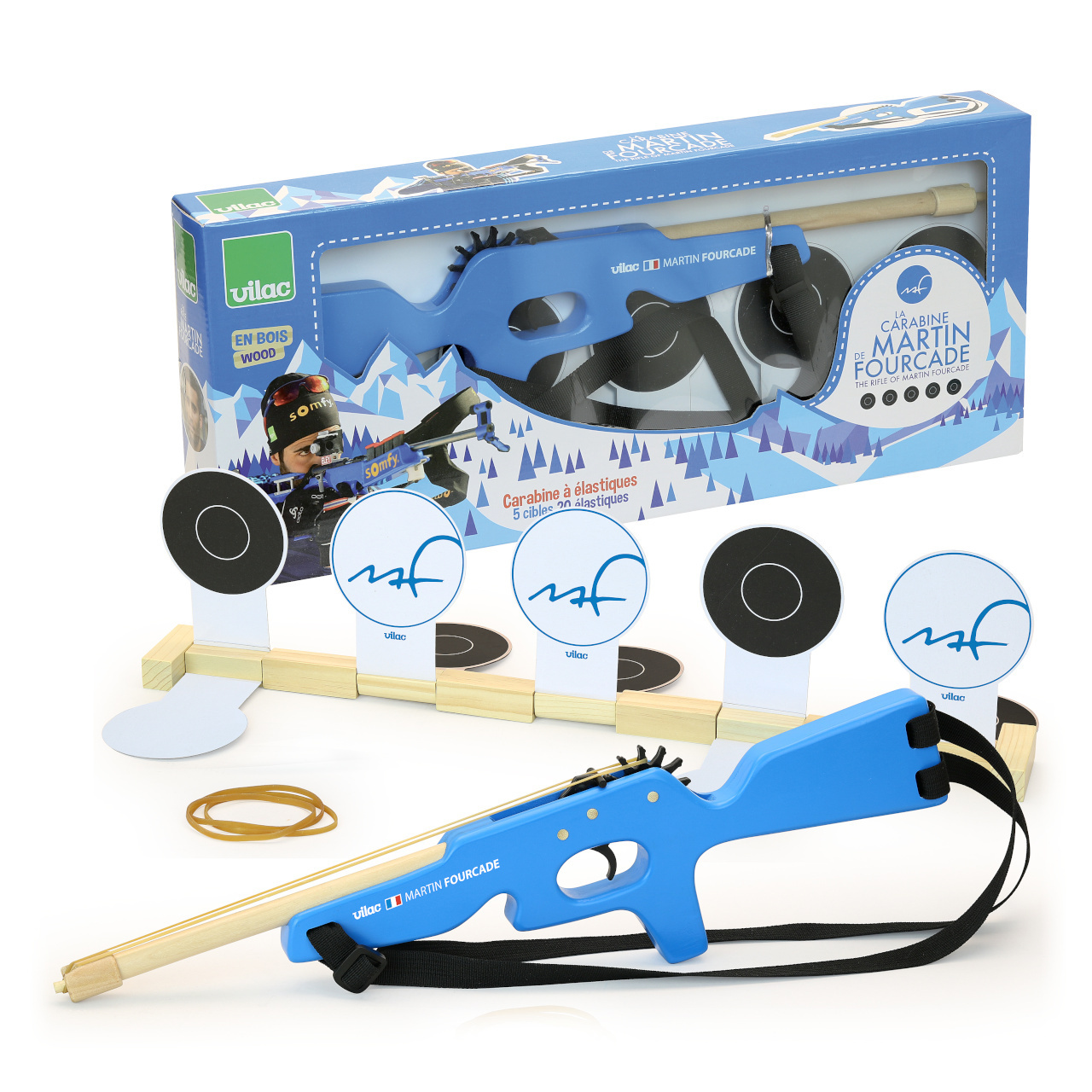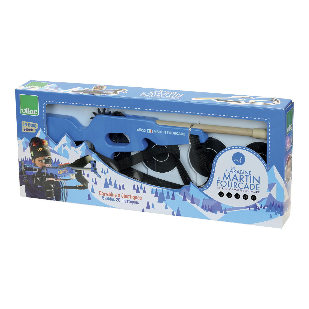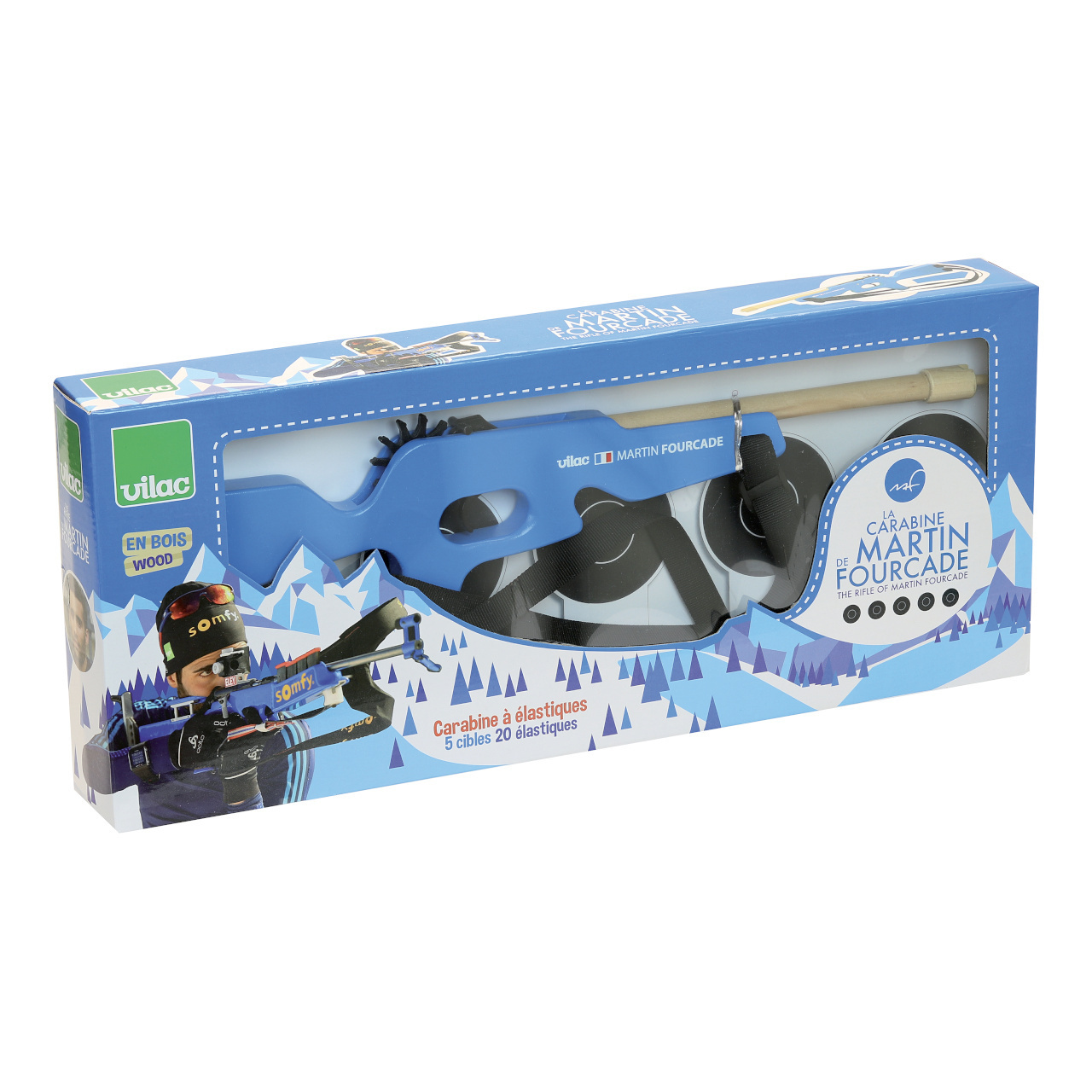 textilní popruhy. Pažba malorážky je modrá, pod hlavní je umístěna vlajka Francie a jména autorů projektu – Martin Fourcade, Vilac. V balení najdete pět sklopných terčů a dvacet gumiček. Nastavte popruhy tak, aby vyhovovaly vašemu synovi, dceři nebo vám samotným. Postavte