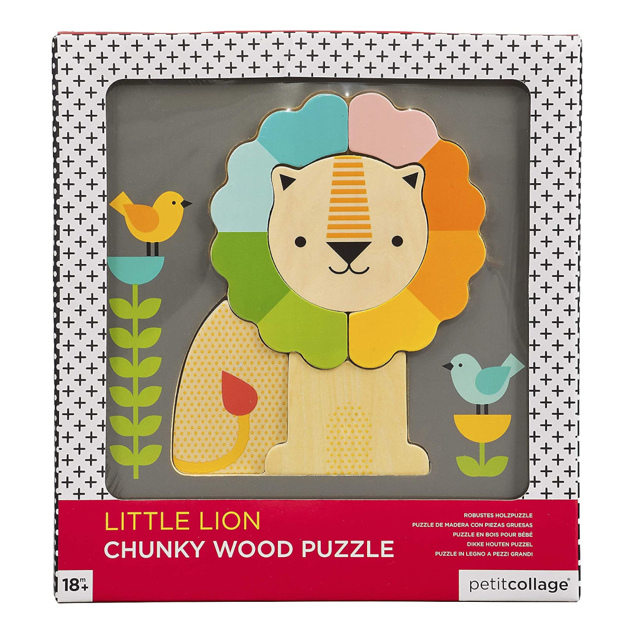 Postavte si přátelského lva s veselou duhovou hřívou s tímto dřevěným logem Little Lion Chunky od Petit Collage! Malé děti mohou snadno uchopit pět robustních dřevěných kousků a vytvořit tak svého malého lvího kamaráda na barevné scéně. Pro děti od 18 měsíců. Hlavní