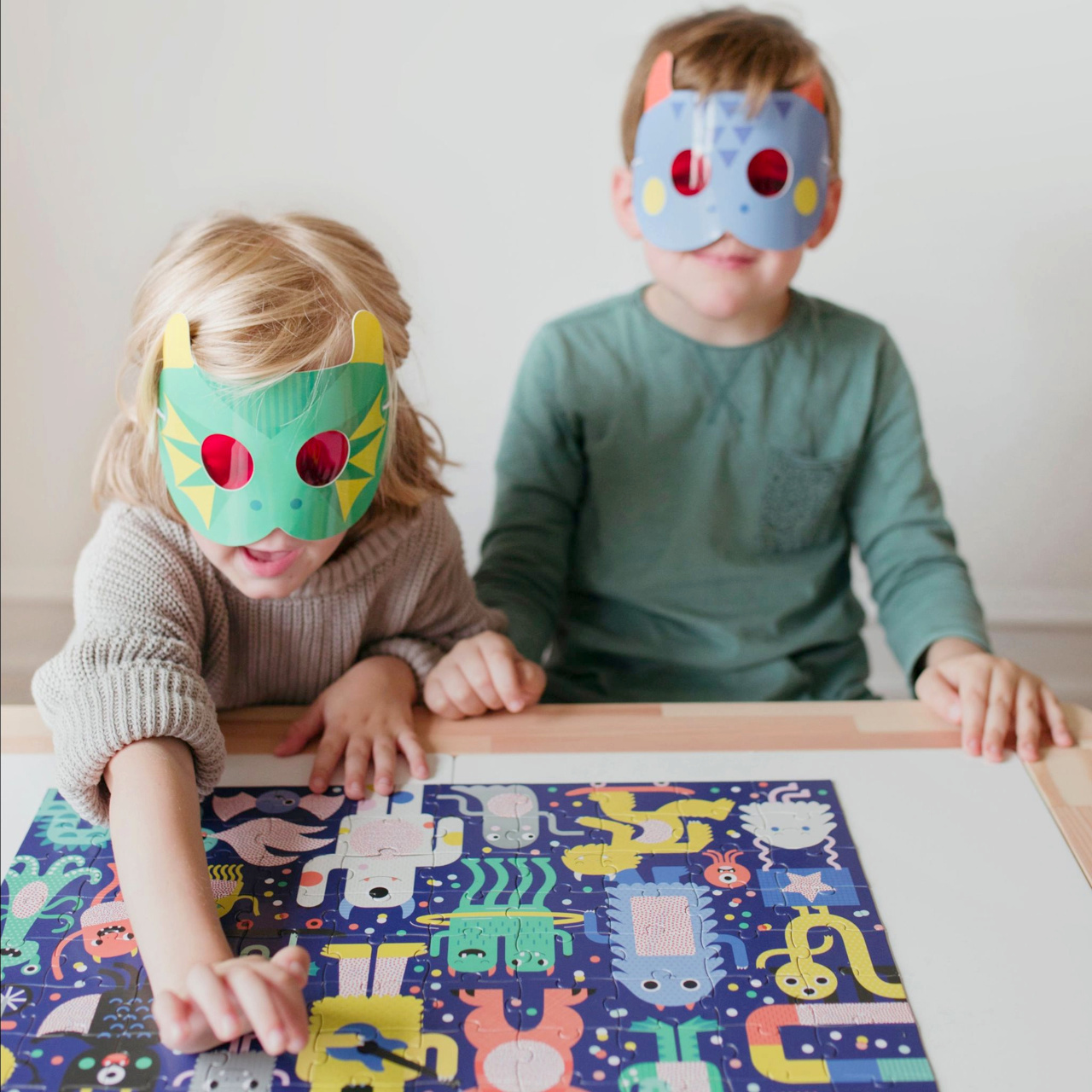 5 sladkostí, 4 objekty s kolečky, 3 pokrývky hlavy, 2 objekty spjaté s hudbou, 1 páchnoucí věc. Hlavní vlastnosti: 2 masky s 3D fóliemi100 dílků puzzlerecyklovaný FSC papírpotištěno netoxickými barvami Značka a certifikát FSC® (Forest Stewardship Council) zaručuje,
