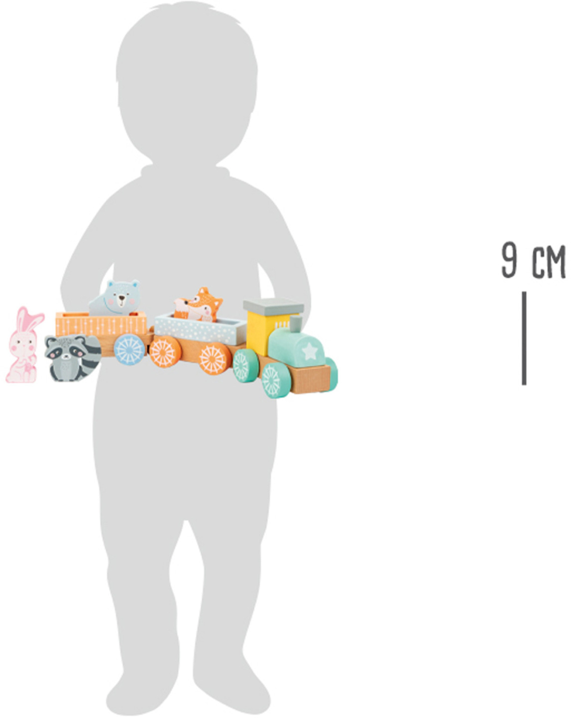 Hú, hú, přijíždí vlak! Tento vláček v pastelových barvách veze veselé pasažéry. Dva vagóny můžete jednoduše spojit. Malá lokomotiva se skládá z podvozku a dvou nasazovacích kostek. V balení také barevná liška, zajíc, mýval a medvěd, kteří už čekají na odjezd vlaku. Hlavní vlastnosti: 1...