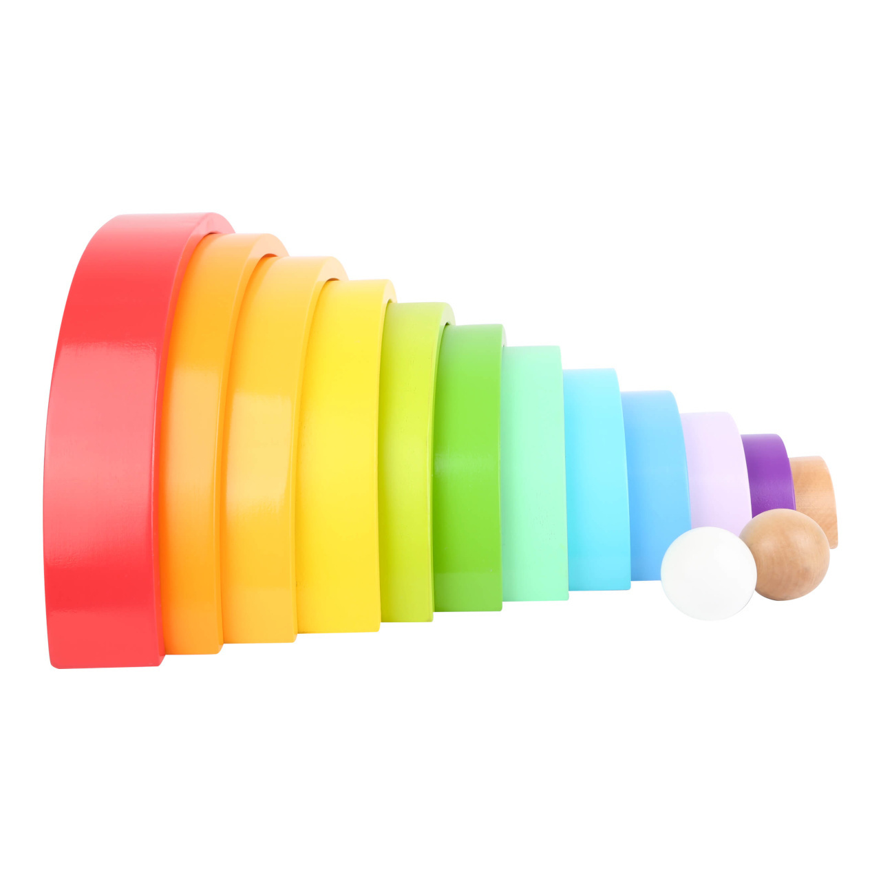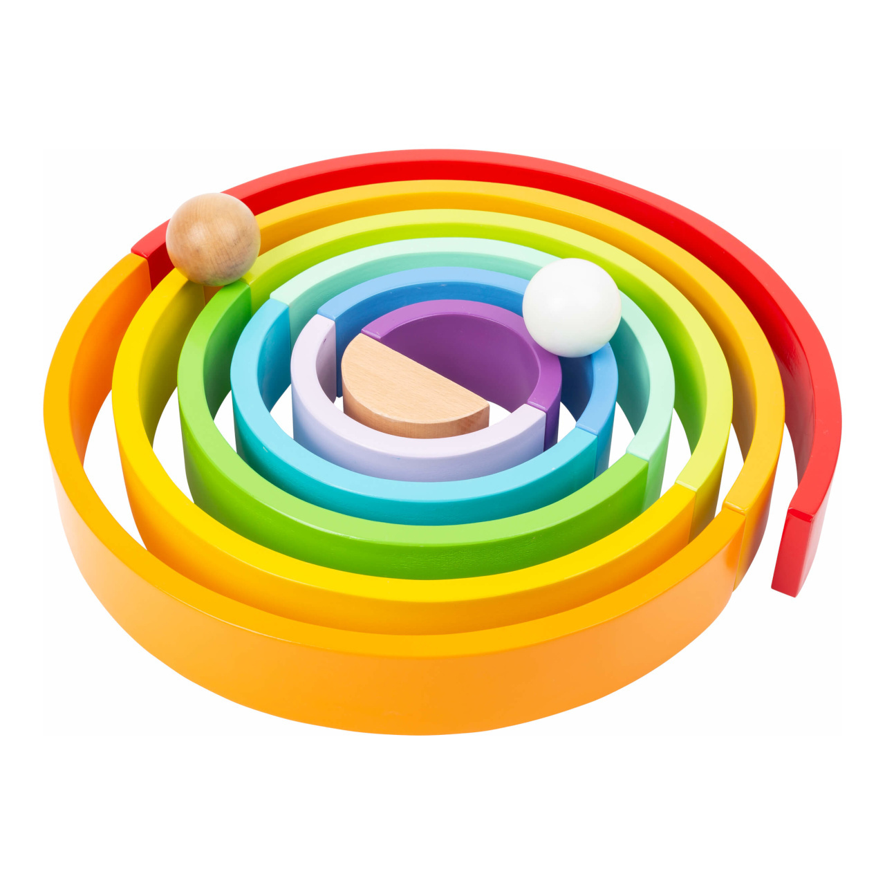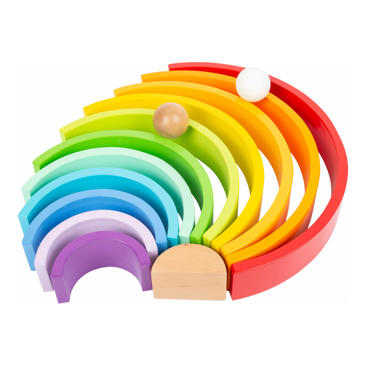 Barevná zábava zaručena! Duha včetně 2 dřevěných kuliček je vyrobena z odolného dřeva v pestrých barvách. Složená duha patří na každou polici v pokojíčku, má mnoho variací skládání a hraní. Z duhy lze vytvořit také dráhy pro kuličky, vysoká věž nebo houpačka pro plyšáky. Je všestranná a...