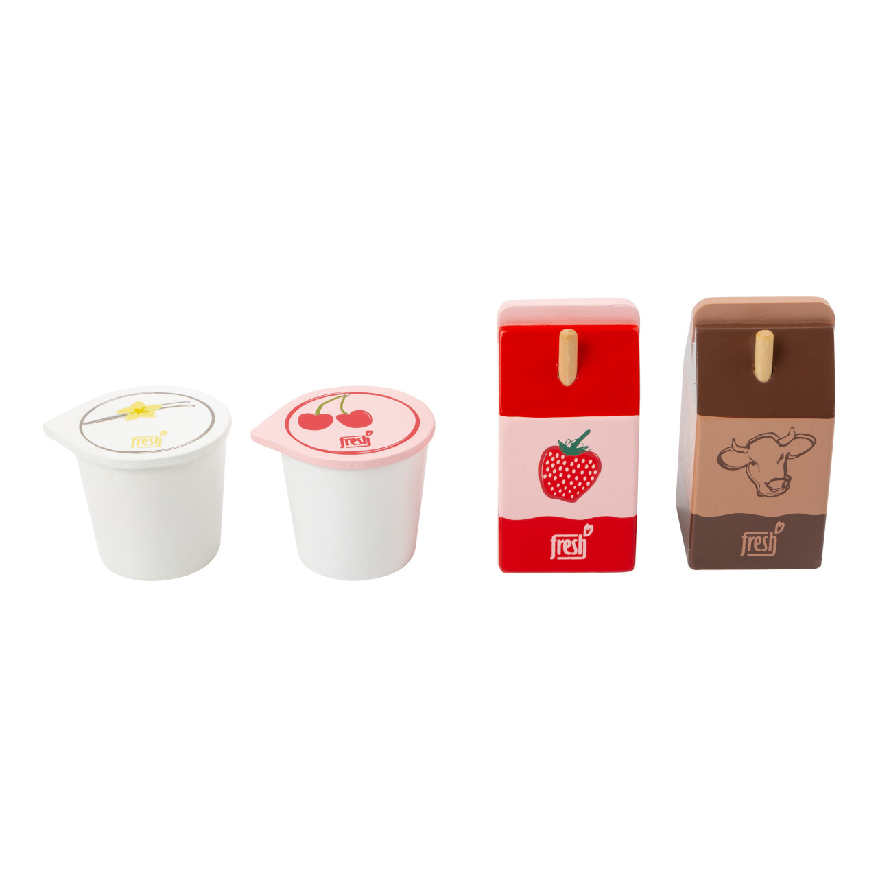 Z lednice rovnou do nákupního košíku. Tyto čtyři dřevěné mléčné produkty jsou ideálním doplňkem dětských kuchyněk nebo prodejních stánků. Kromě jahodového je zde i kakaové mléko, obě s brčkem. Sada dále obsahuje maketu vanilkového a třešňového jogurtu. Realistická hračka, která se dětem bude...