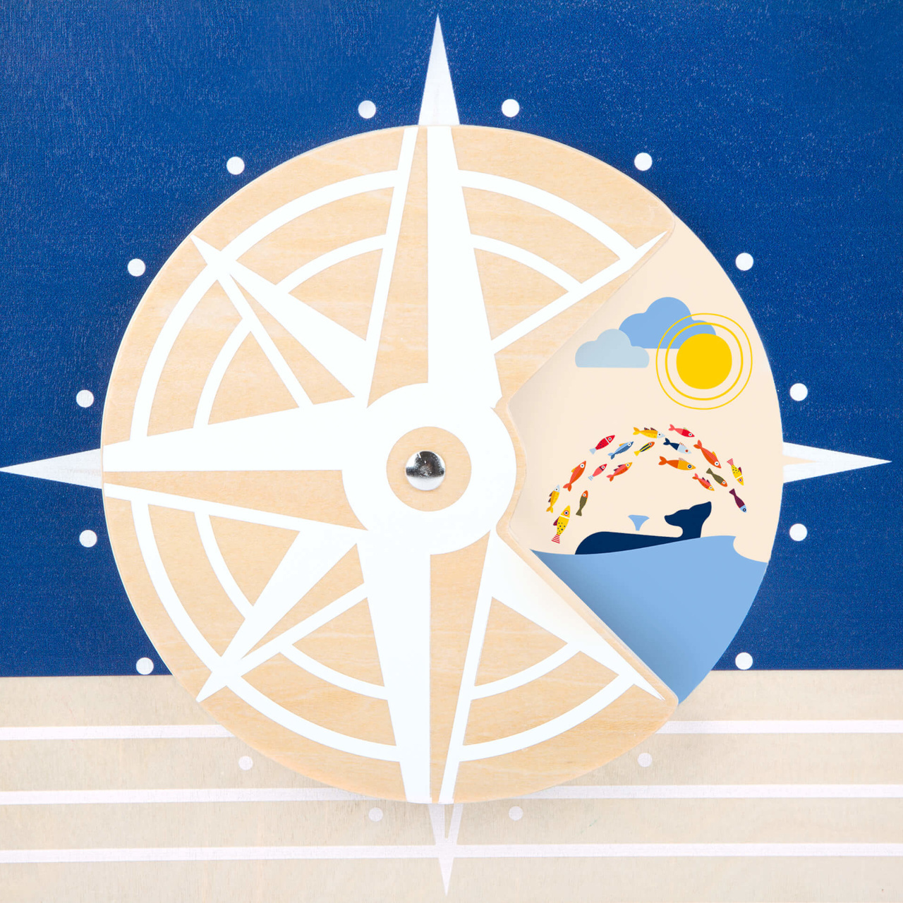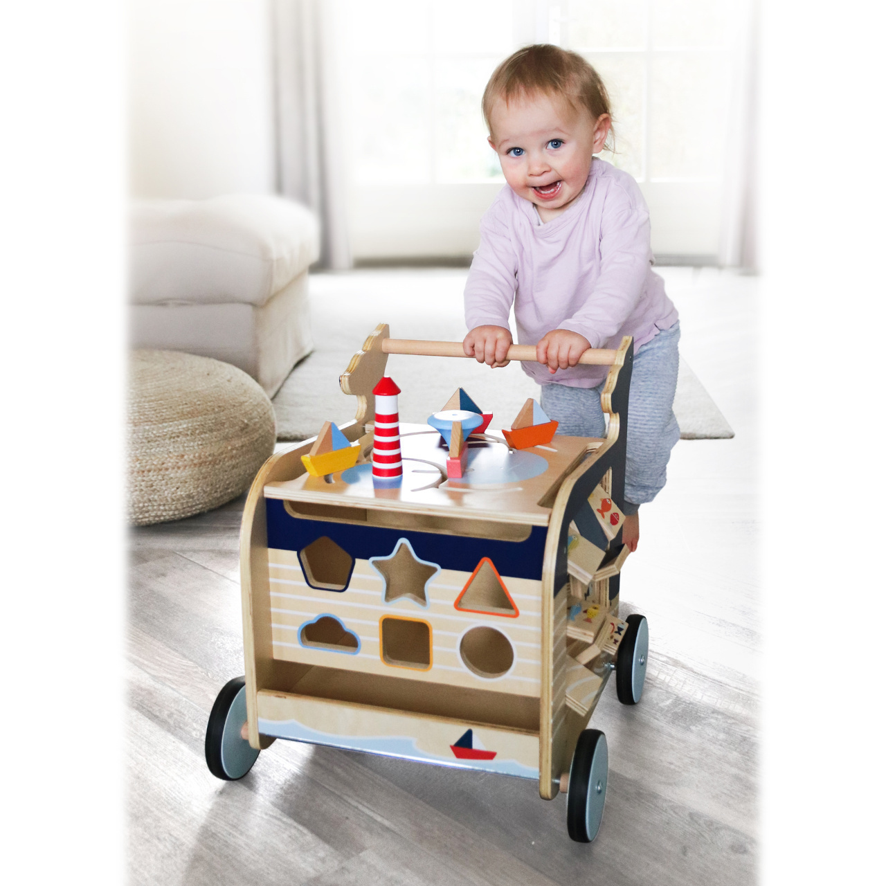 Pojďme na průzkum s velrybou! Toto dřevěné chodítko ve tvaru velryby pomůže dětem s prvními kroky a zároveň nabídne hračky k rozvoji motoriky. Chodítko se drží stylu mořského světa a jeho živočichů. Na čtyřech stranách chodítka naleznete hry jako vkládání tvarů, otáčení obrázků nebo kreslící...