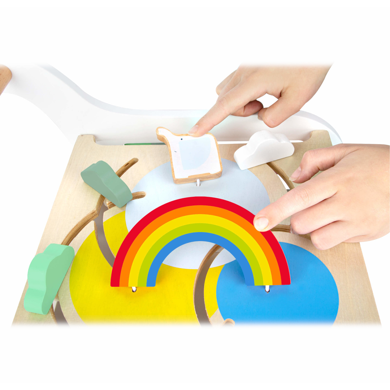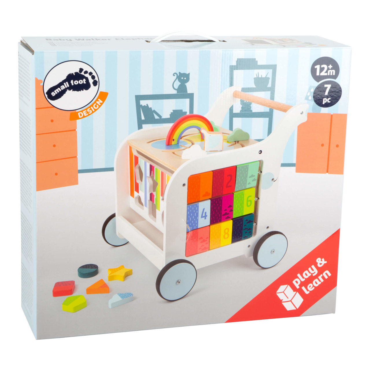 Chodítko ve tvaru slona je multifunkčním doplnkěm pro hru i výuku, přináší zábavu na všech svých pěti stranách! Děti se mohou zabavit duhovým labyrintem, vkládačkou s různými tvary, kreslením na tabulku, nebo otáčením a odklápěním různobarevných prvků. Svrchní