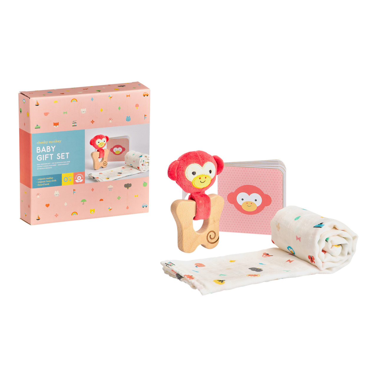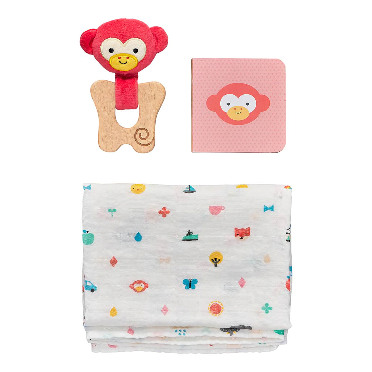 Opičí sada je perfektní pro dítě a zároveň šetrná k životnímu prostředí. Obsahuje vše, co noví rodiče potřebují pro odříhávání, růst zoubků... Sada obsahuje tři dárky a je zabalena bez použití plastů. Hlavní vlastnosti: Kousátko z FSC certifikovaného bukového