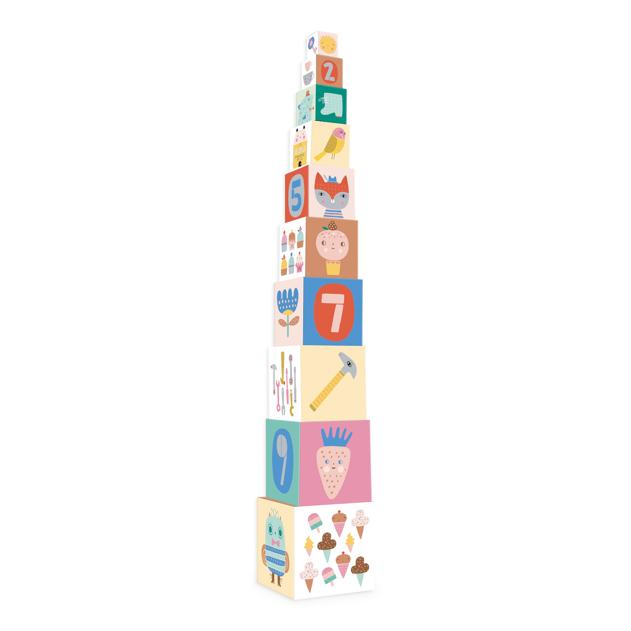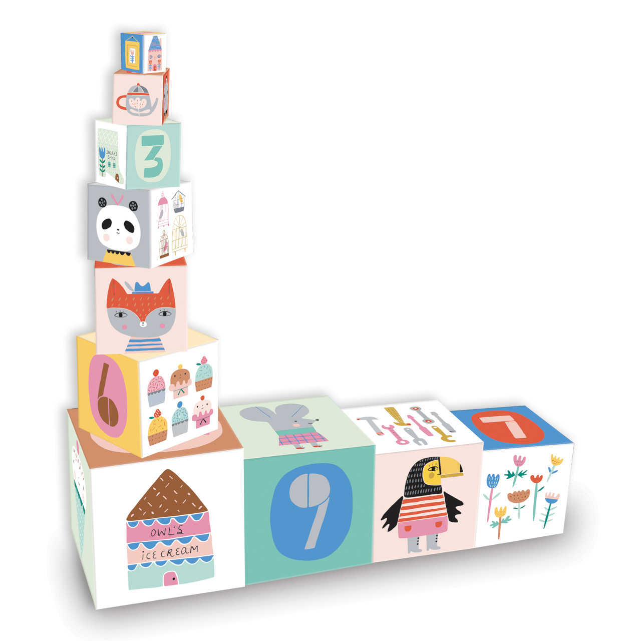 Rozměr balení: 14,5x14,5x14,5 cm Věk:2+ Materiál: karton Počet: 10 ks kostek Design Suzy Ultman