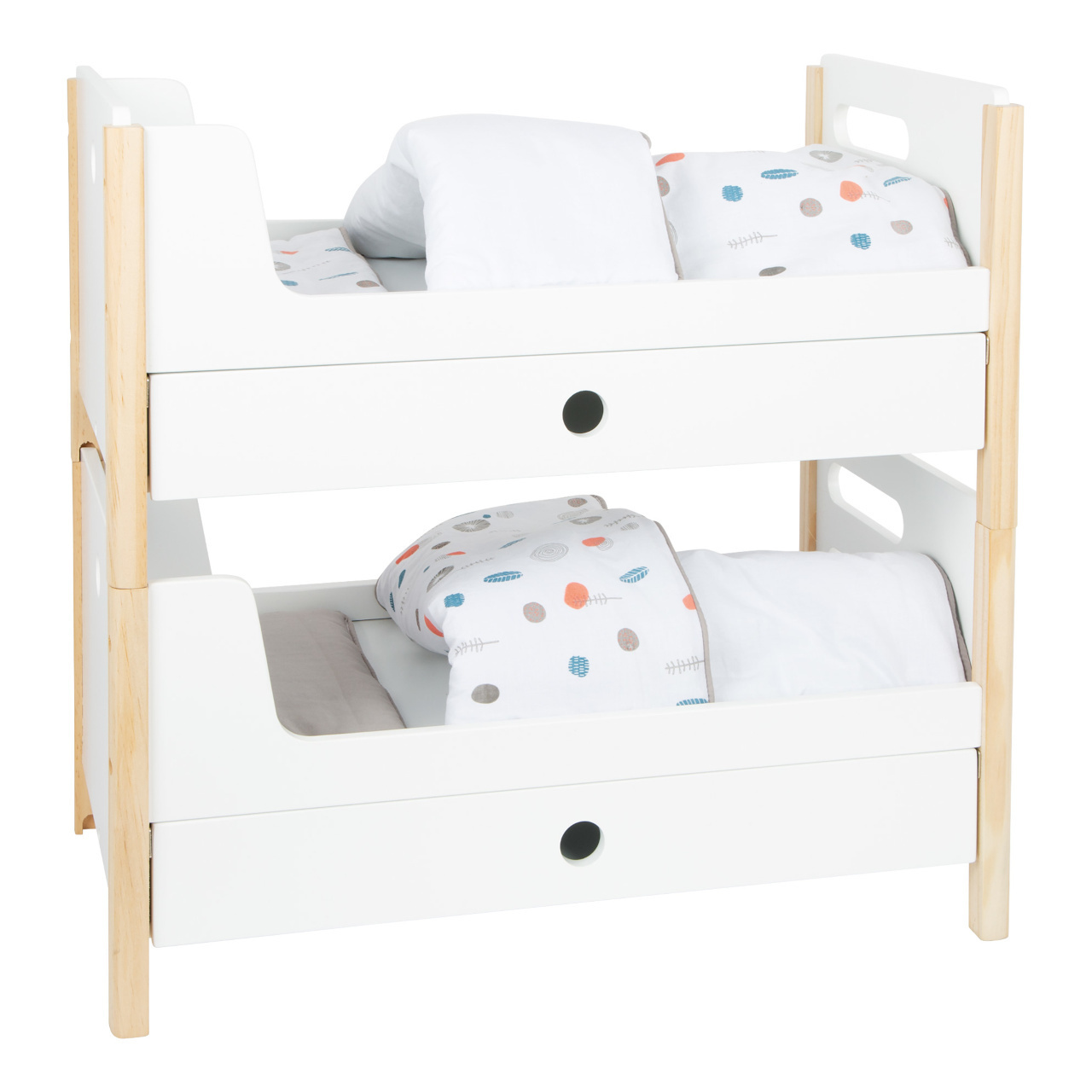 pokoje. Hlavní vlastnosti Můžete použít jako jednolůžka nebo poschoďovou postelŠuplíky pro uložení doplňků panenekGenderově neutrální povlečeníOversized peřinyZaoblené hrany, viditelně dřevěnáPro panenky a plyšáky do 46 cmSkandinávský lineární design Little Button
