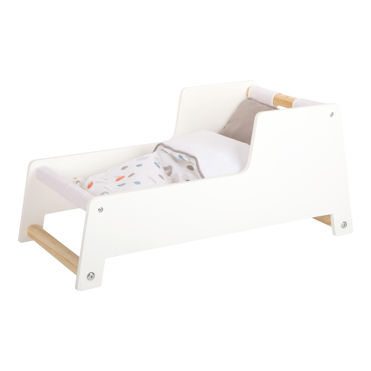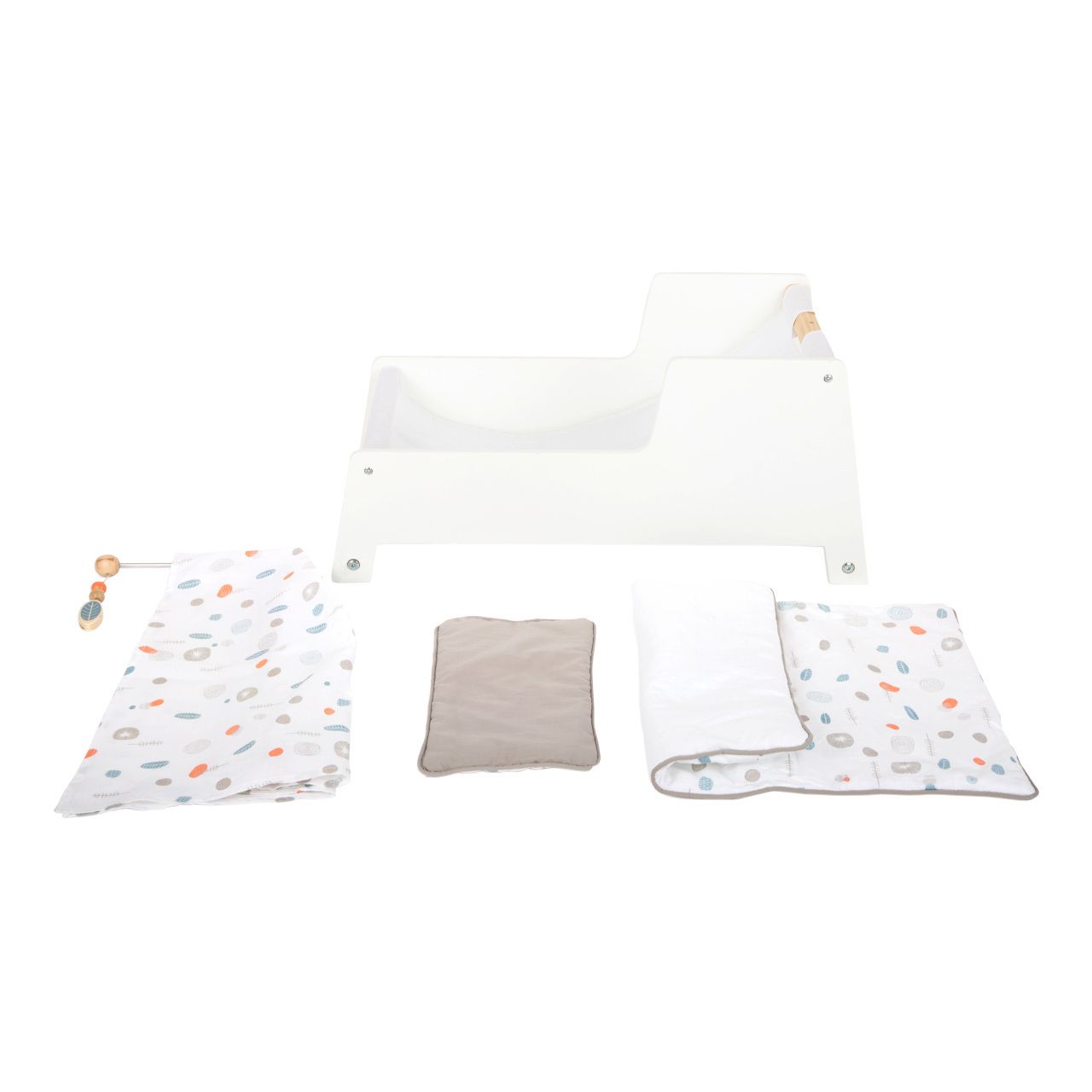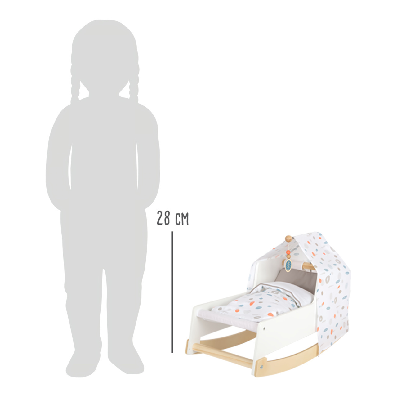 Panenky také potřebují spát! Tato moderní kolébka ve skandinávském designu je genderově neutrální, má oboustranné povlečení a pod velkou peřinou mohou spát panenky a plyšáci do 46 cm. Spodní část tzv. lyže kolébky jsou oddělitelné, stejně jako baldachýn. Vysoce
