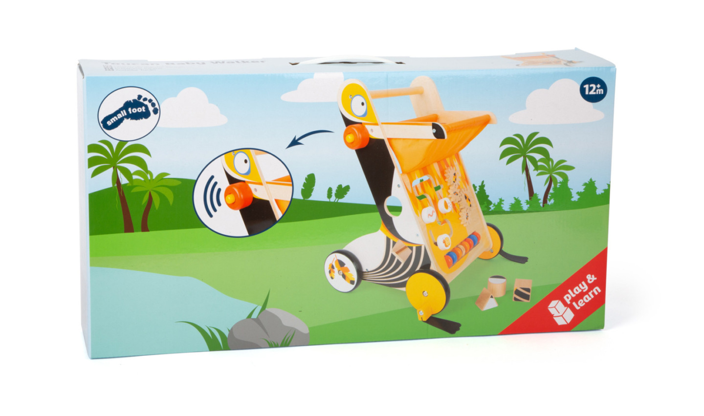 jemnou motoriku. „Zobák“ a spodní část chodítka nabízejí úložný prostor pro dřevěné kostky či jiné hračky. Tukan má na předních kolech „nožičky“, které při pohybu vydávají vtipný zvuk. Pogumovaná kolečka také zajištují tichý chod po pevných podlahách.