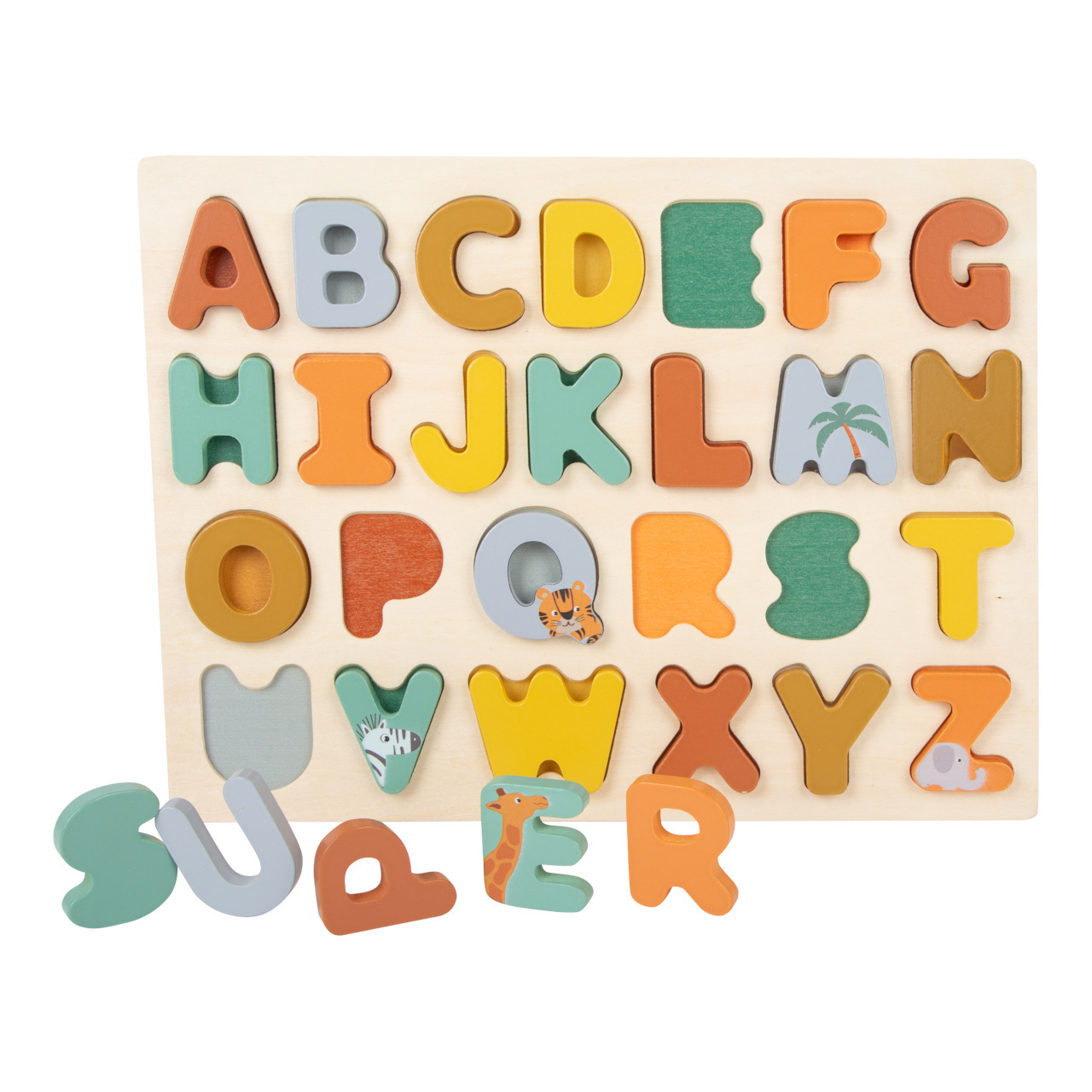 Naučte se abecedu hravým způsobem! S tímto dřevěným puzzlem v trendy barvách se děti naučí abecedu a procvičí si jemnou motoriku formou hry. Najdete zde 26 vystouplých dřevěných písmen, která lze jednoduše uchopit a vložit do správných otvorů i malýma rukama. Můžete je ale také postavit mimo své...