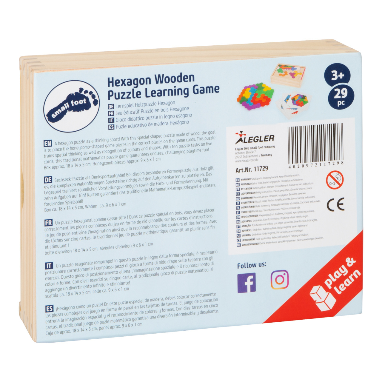 Mozaika ve tvaru hexagonu potrénuje logiku dětí! Speciální puzzle vyrobené ze dřeva je krásně barevné. Cílem je postavit dílky do správného pořadí dle obrázku. Toto puzzle trénuje prostorovou představivost, naučí děti poznávat barvy a tvary. Na pěti kartičkách najdete deset obrázků rozložení...