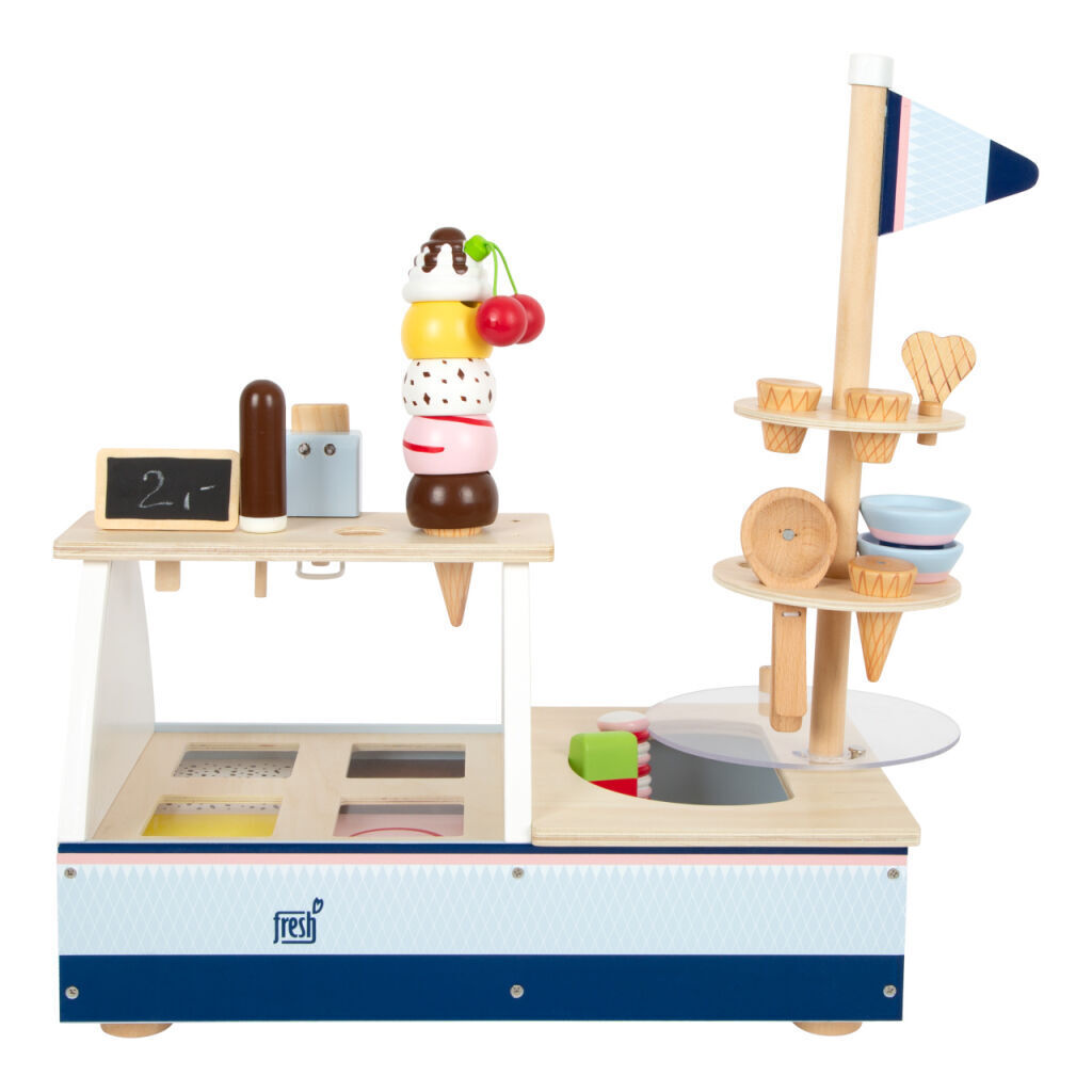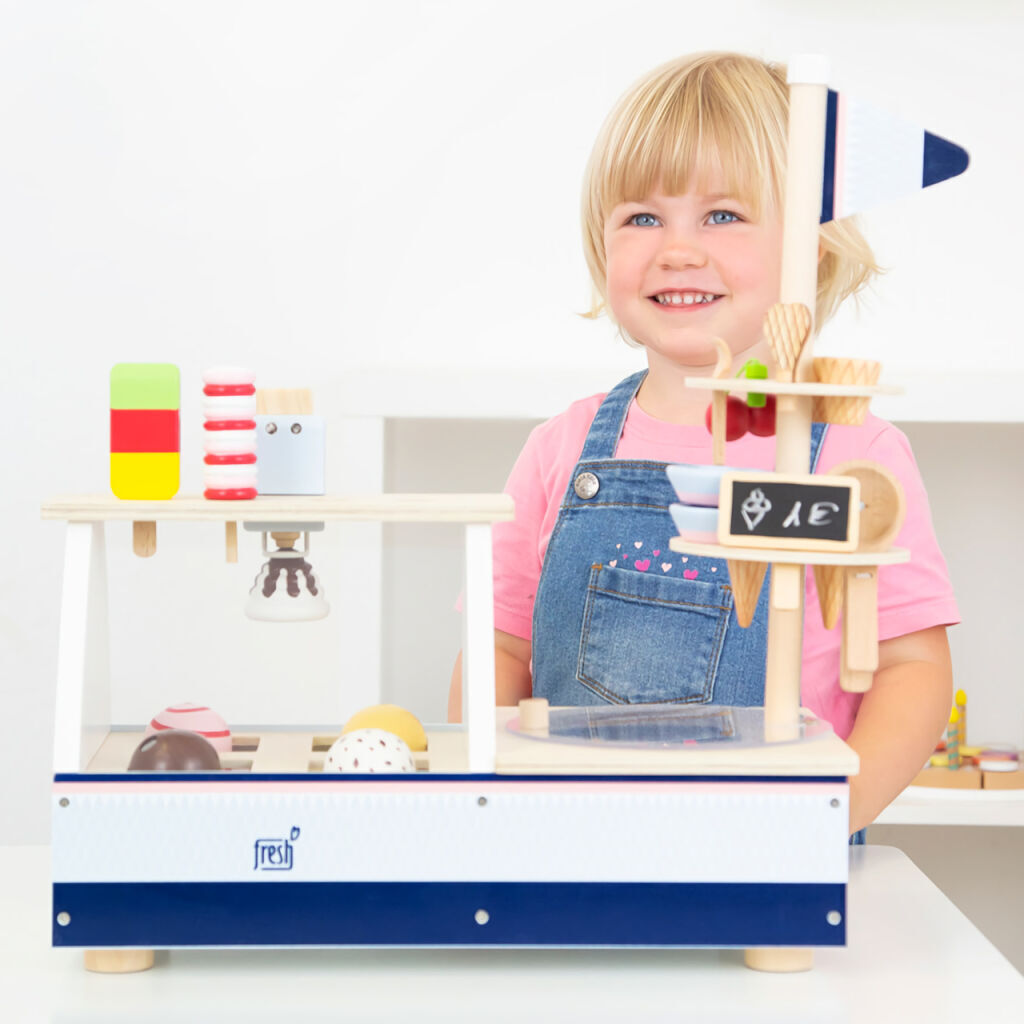 Jdeme na zmrzlinu! Tento dřevěný zmrzlinový set je perfektní na léto i zimu. Zmrzlinový stánek je modro-růžový, má také prvky přírodního dřeva, zákazníky nadchne velkým výběrem dezertů a svými funkcemi a příslušenstvím. Můžete si dát více kopečků zmrzliny,