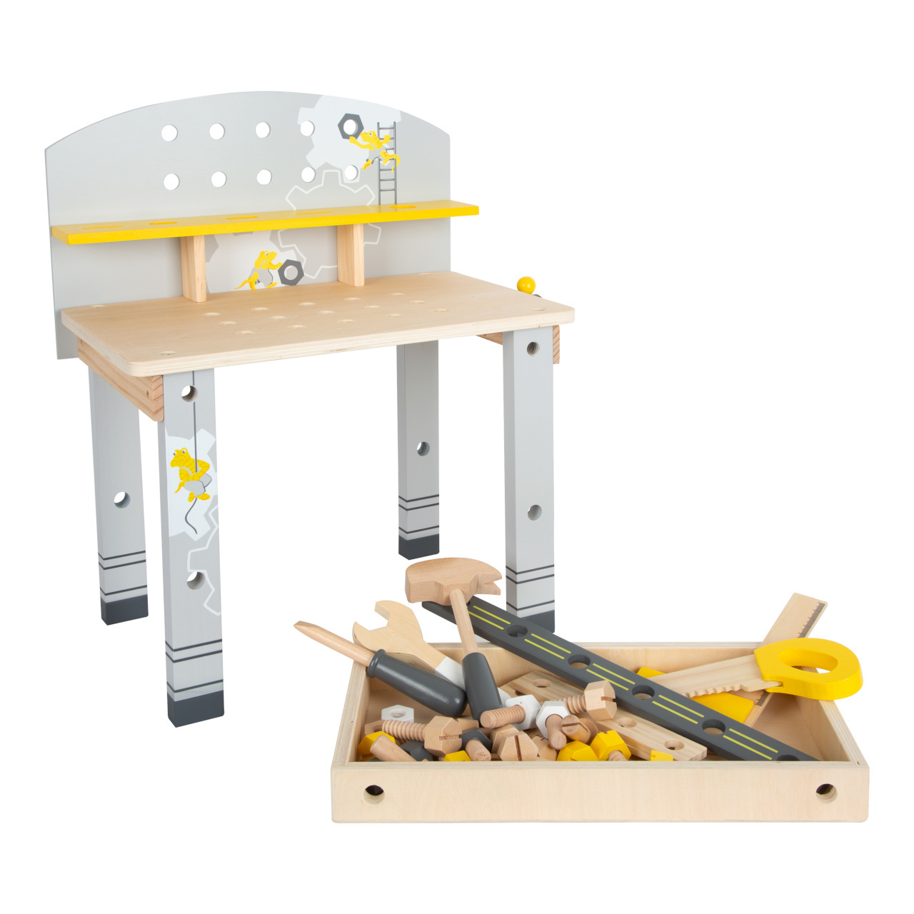 a rozšiřovat s rostoucími dovednostmi dětí. Díky jednotícímu barevnému motivu a vyobrazením roztomilých Wobů je možno vytvořit jedinečný a ucelený dílenský koutek, který bude zároveň hodnotnou stavebnicí rozvíjející zručnost a představivost.