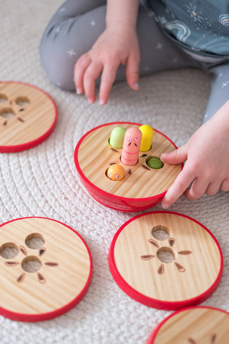 Dřevěná, 9 dílná skládačka jablka zdobeného plstěným lístkem, v jasných barvách. Procvičujte jemnou motoriku, koordinaci zraku a rukou i prostorovou představivost, aniž byste ubírali na zábavě. Každý červík vykukující ze základního dílu má jinou výšku, skládejte jablko po vrstvách tak, aby...