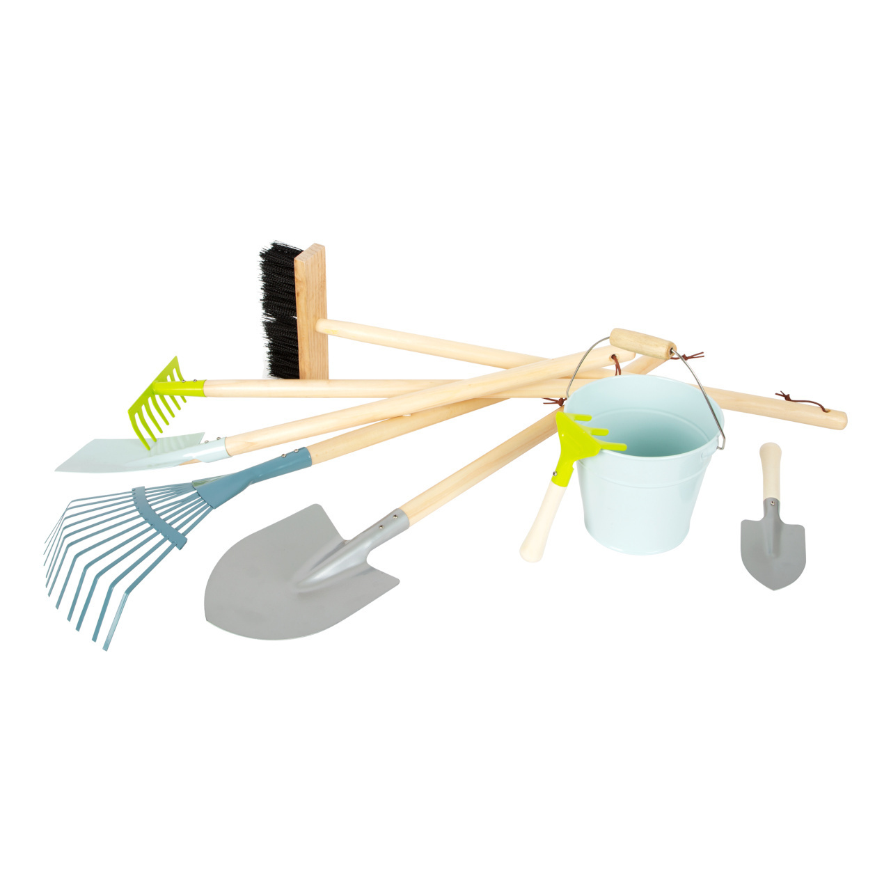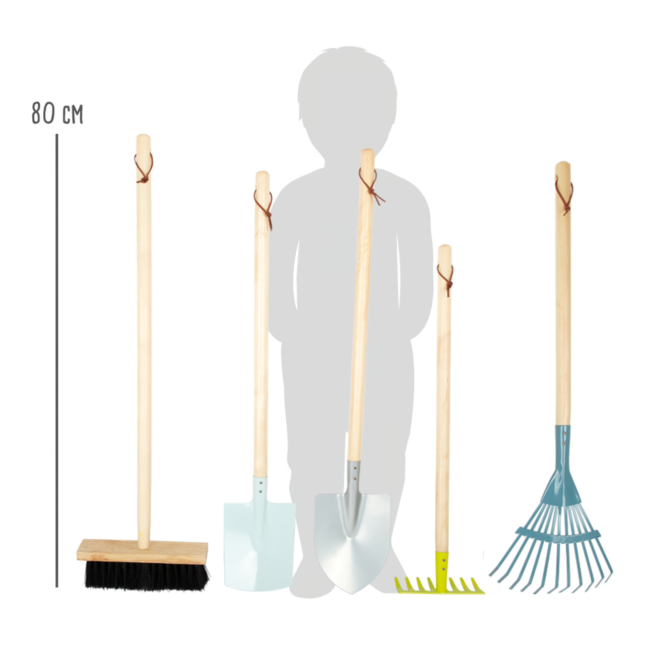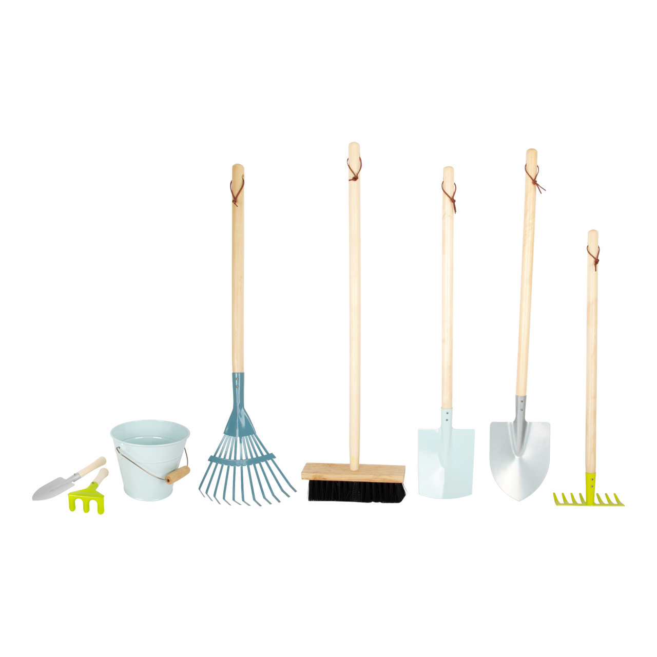 Tato komplexní sada zahradního nářadí v moderních barvách se skládá z kovového kylíku, rýče, lopaty, hrábek, košťete, lopaty a dvou malých zahradnických nástrojů pro práci na zahradě. Po dokončení práce lze nástroje z robustního dřeva a kovu řádně zavěsit na praktické smyčky. Tato sada je...