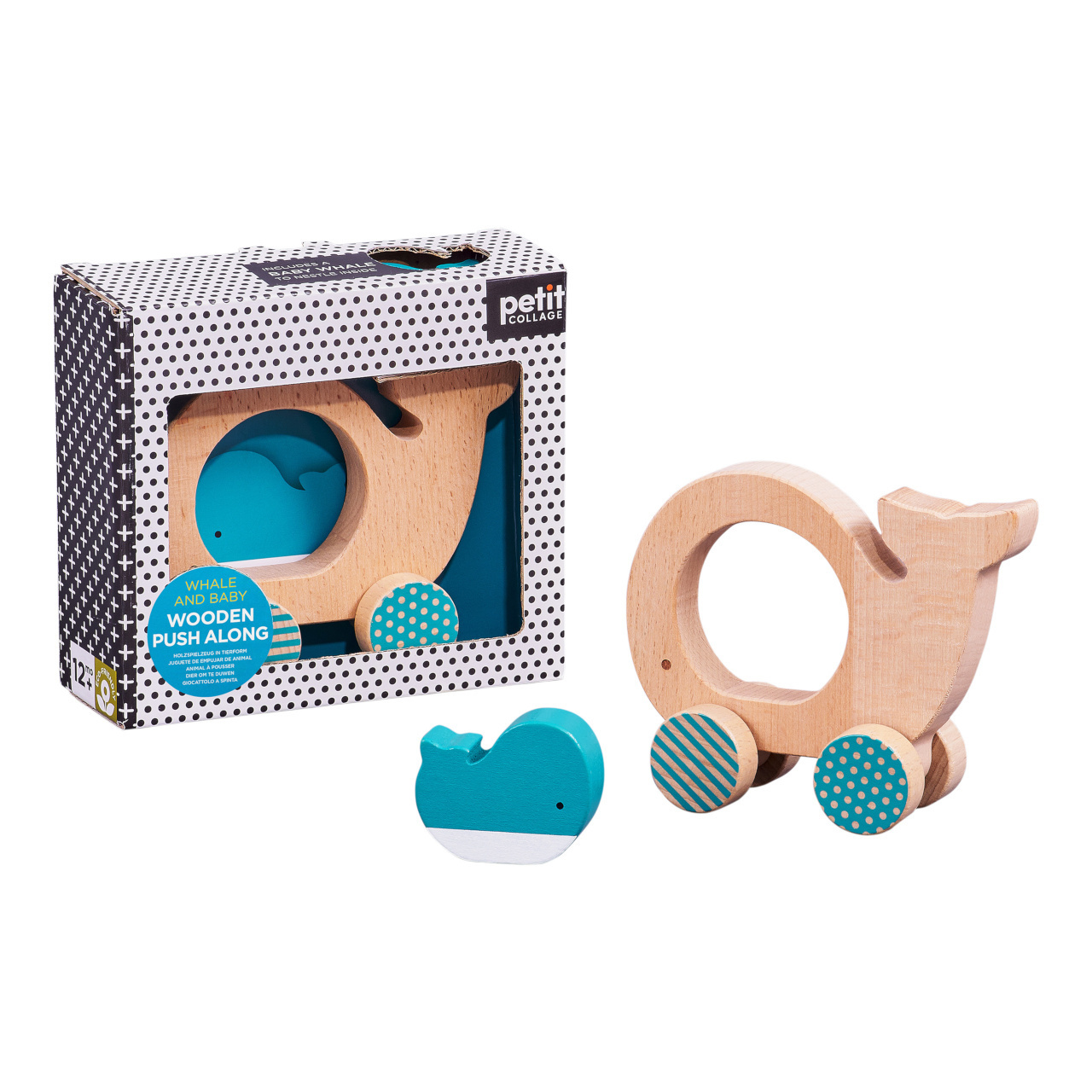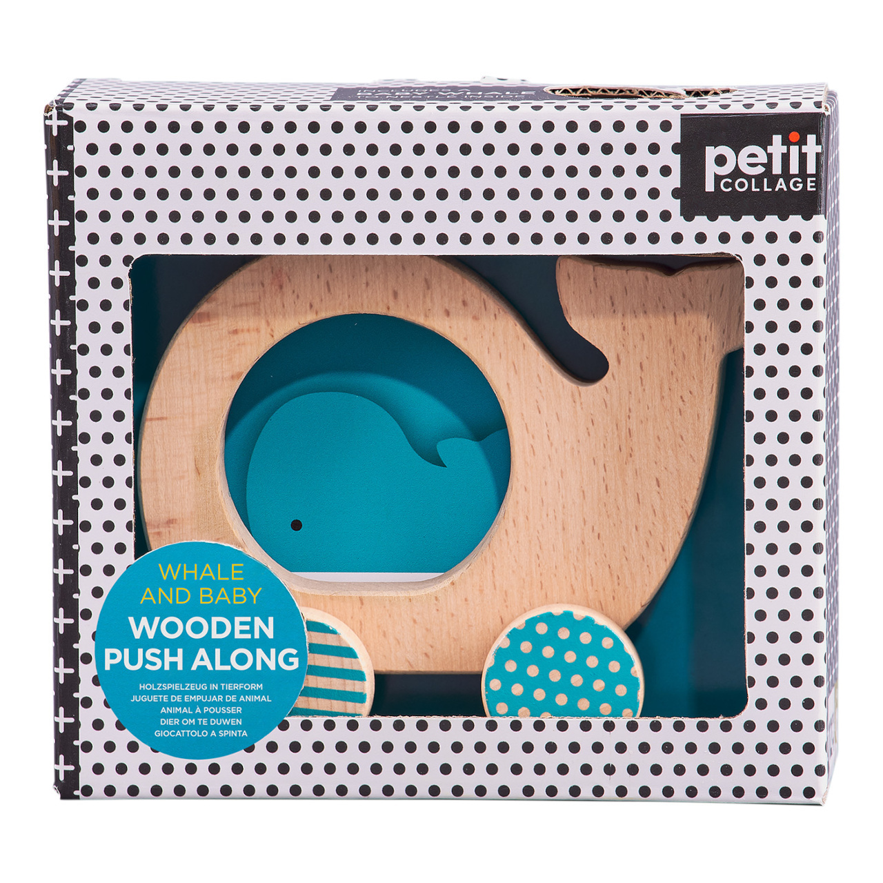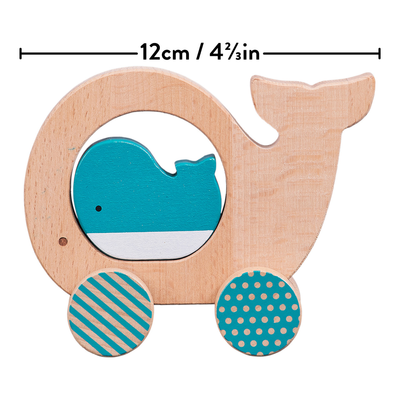 Dřevěná velryba na kolečkách je zaoblená a jednoduše uchopitelná. Uprostřed má hračka otvor, v němž je volně uložena figurka mláděte. Je zabalená v krásné krabici a je perfektním dárkem pro maminky v očekávání, nebo jako narozeninový dárek dětí. Vyrobeno z bukového