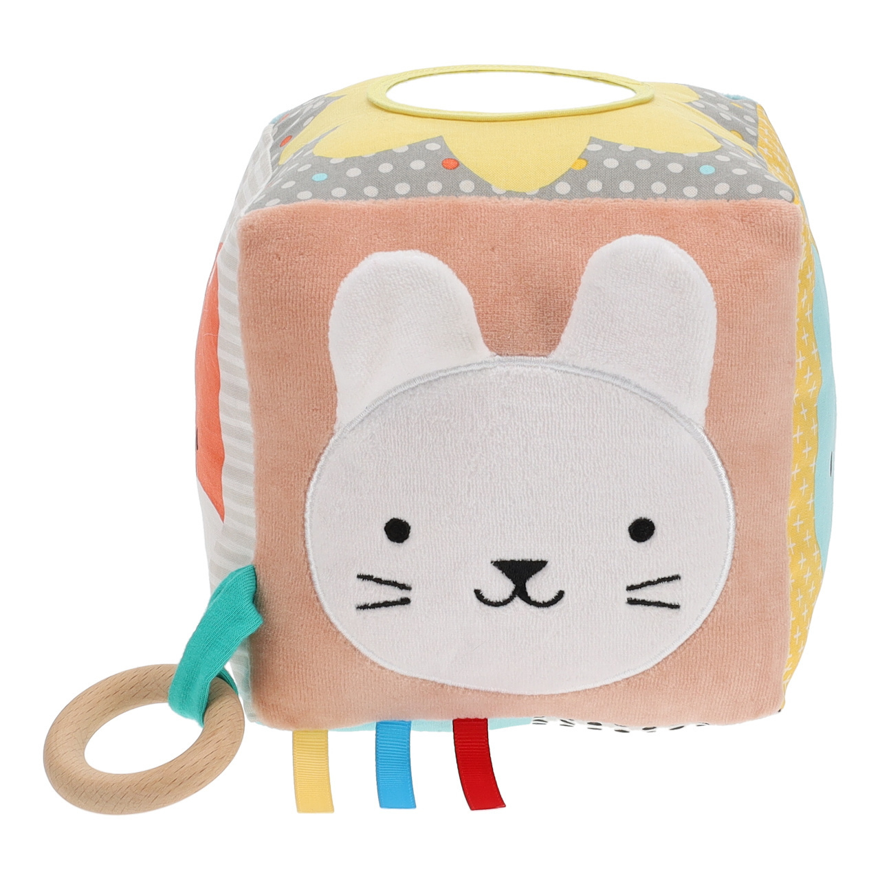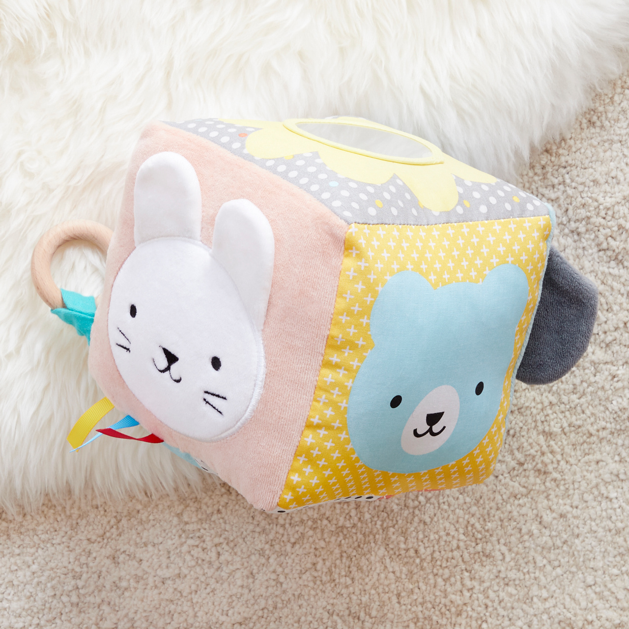 Měkká a hebká kostka provedením stimuluje hmat nejmenších. Je vyvedena v kontrastních barvách a vybavena rolničkou, aby poutala pozornost. Na stěnách jsou vyobrazeny přátelské obličeje zvířátek, které stimulují zvědavost vyčnívajícími oušky. Kostka je také vybavena zrcátkem, dozdobena několika...