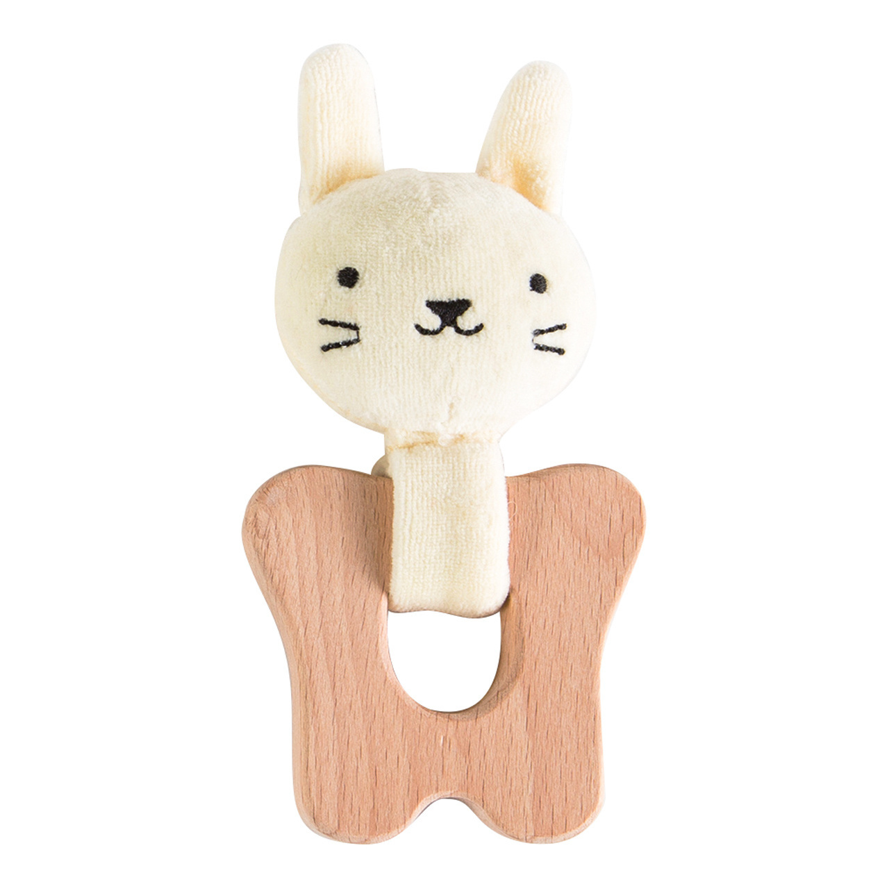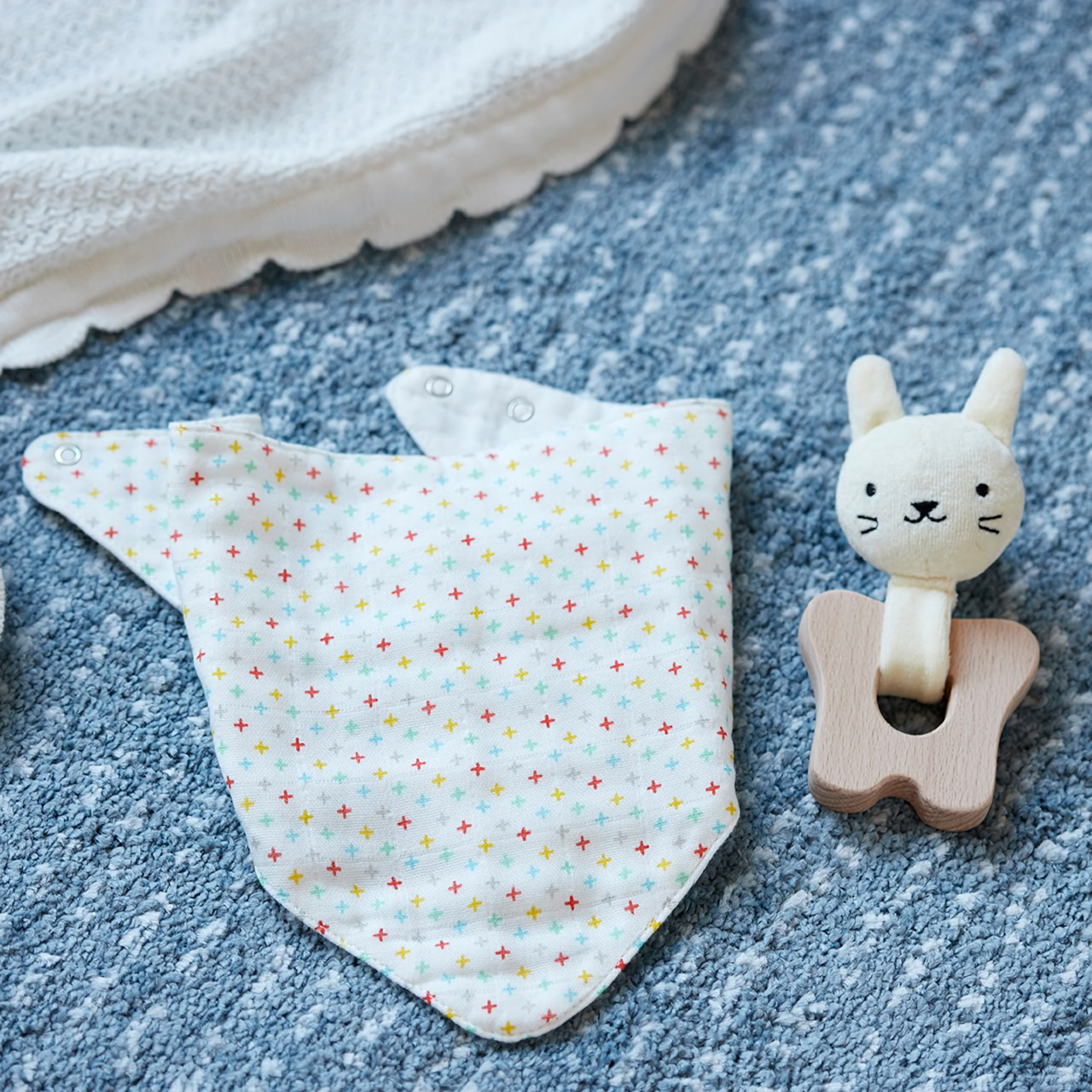 Roztomilý králíček ukonejší a zabaví Vaše dítko. Kousátko je vyrobeno z organické bavlny a pevného FSC® certifikovaného bukového dřeva. Je navrženo pro ručky těch nejmenších, dítě jej snadno uchopí. Součástí soupravy je savý vzorovaný bílý bryndáček z organické