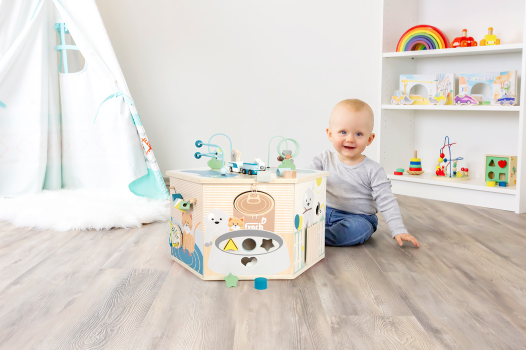 XXL motorická interaktivní kostka ve tvaru hexagonu je vyrobená z pevného dřeva a má různé aktivity na 8 stranách. Najdete zde například korálkový labyrint, vkládačku, otočné destičky, provlékačku/třídení barev a skládačku. Rolnička stimuluje sluch a trénuje sluchové