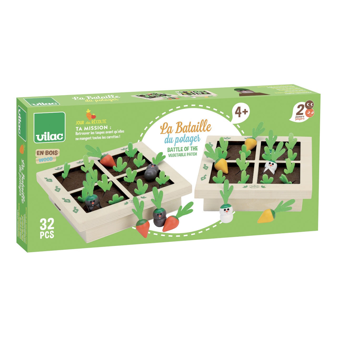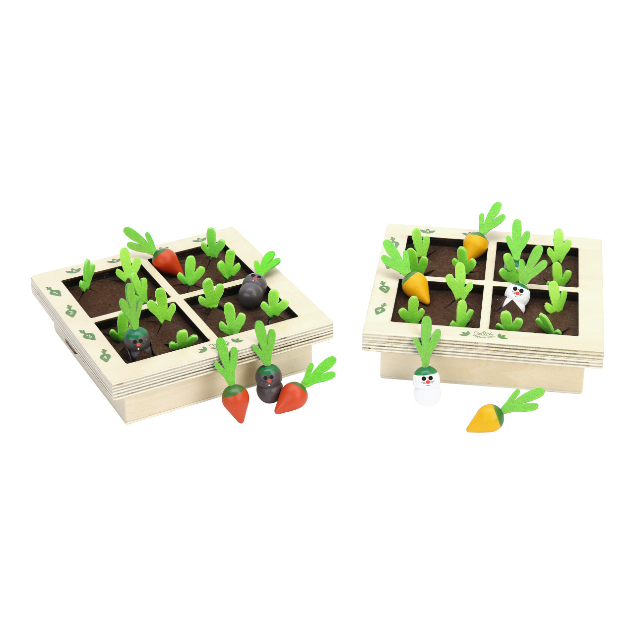 poutavě, tématicky dekorované. Hlavní vlastnosti: pro 2 hráče2 hrací plochy, 2×12 červených mrkví a 2×4 krtci2 herní varianty, vhodné i pro menší dětijedinečné a atraktivní zpracování Zkrácený návod hry:Hráči libovolně do svého záhonku rozmístí krtky a