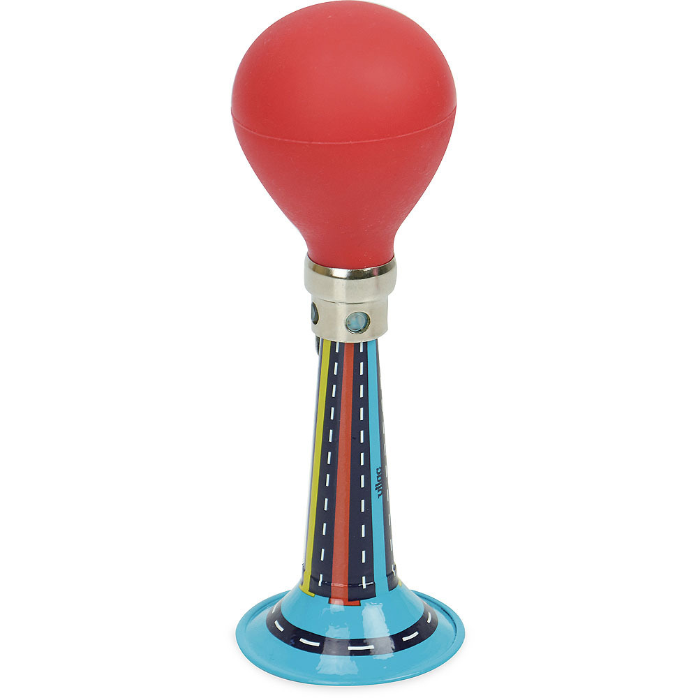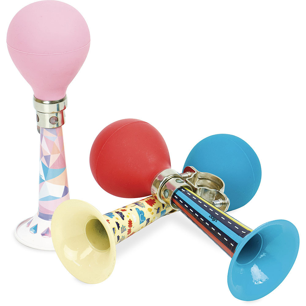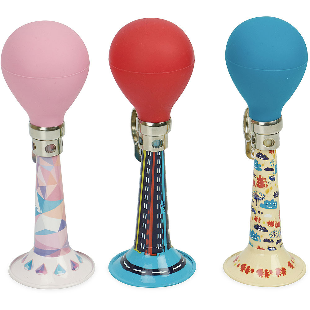 Klakson ve třech barevných provedeních, s kovovým očkem pro připevnění k řidítkům. Hlavní vlastnosti: vhodné na rám dětského kola